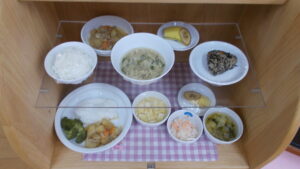 豚じゃがには、豚肉、人参、玉ねぎ、じゃが芋、糸こんにゃくを使用しています。じゃが芋がホクホクで味がよく染みていて美味しかったです。