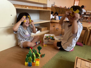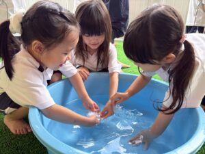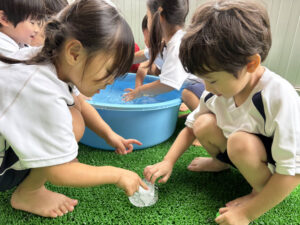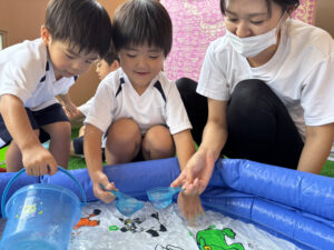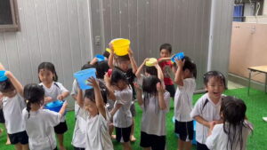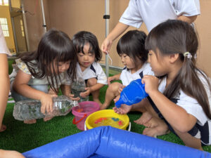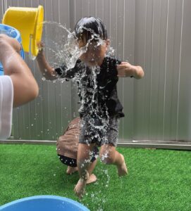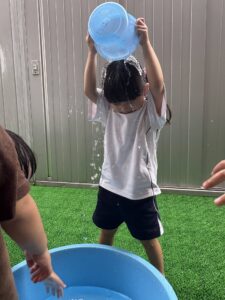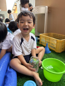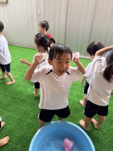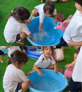 今週で水遊びも一区切りとなり、子ども達は夏ならではの活動を元気いっぱい楽しんでいました。