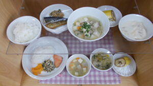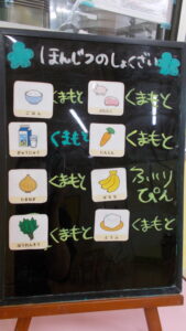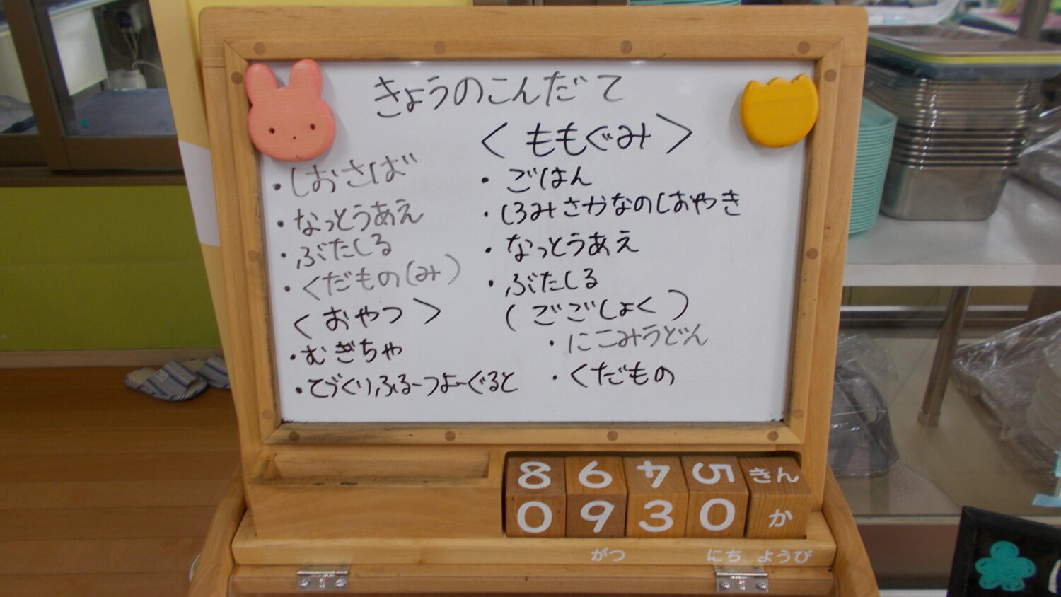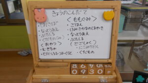 献立に変更があります。おやつが麦茶、フルーツヨーグルトに変わっています。もも組の午後食が煮込みうどんにかわっています。