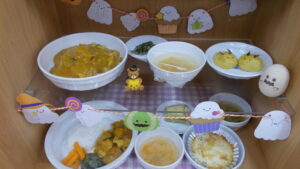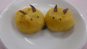 今日は中秋の名月なのでおやつにお月見うさぎスイートポテトを提供しています。ウサギの目は黒胡麻、耳はさつま芋の皮を使用しており、コロコロとした可愛らしいうさぎに仕上がりました。子どもたちも喜んで食べてくれました。