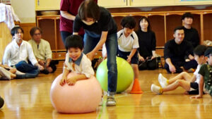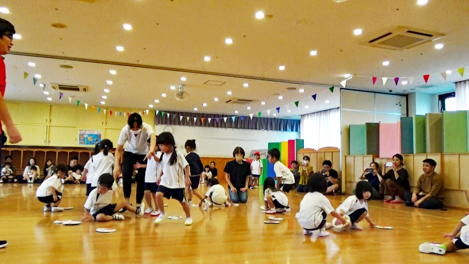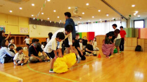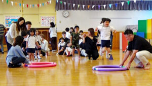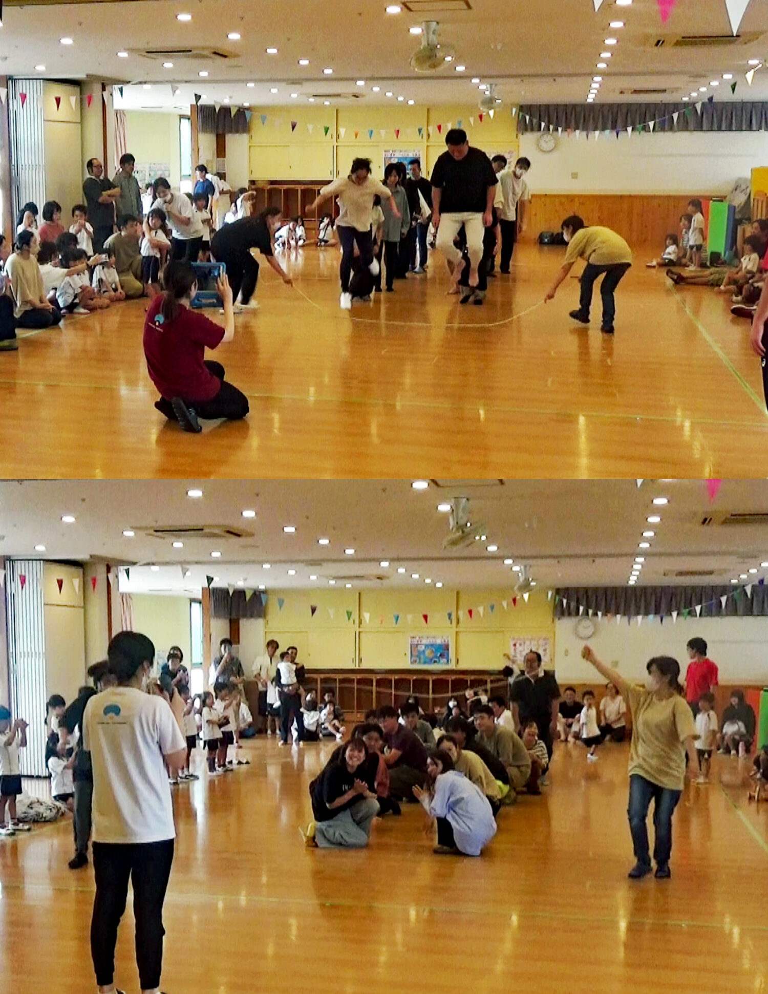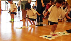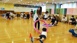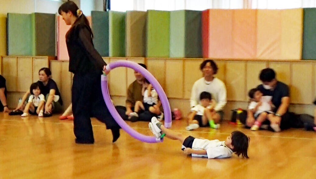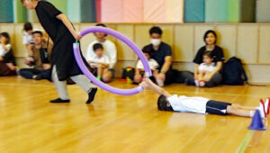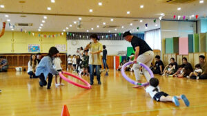 保護者がフープを動かしていき、子ども達はその輪の中にジャンプしながら進みます。