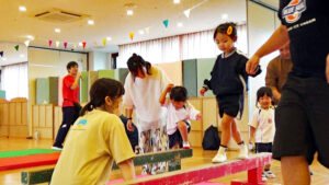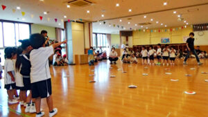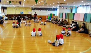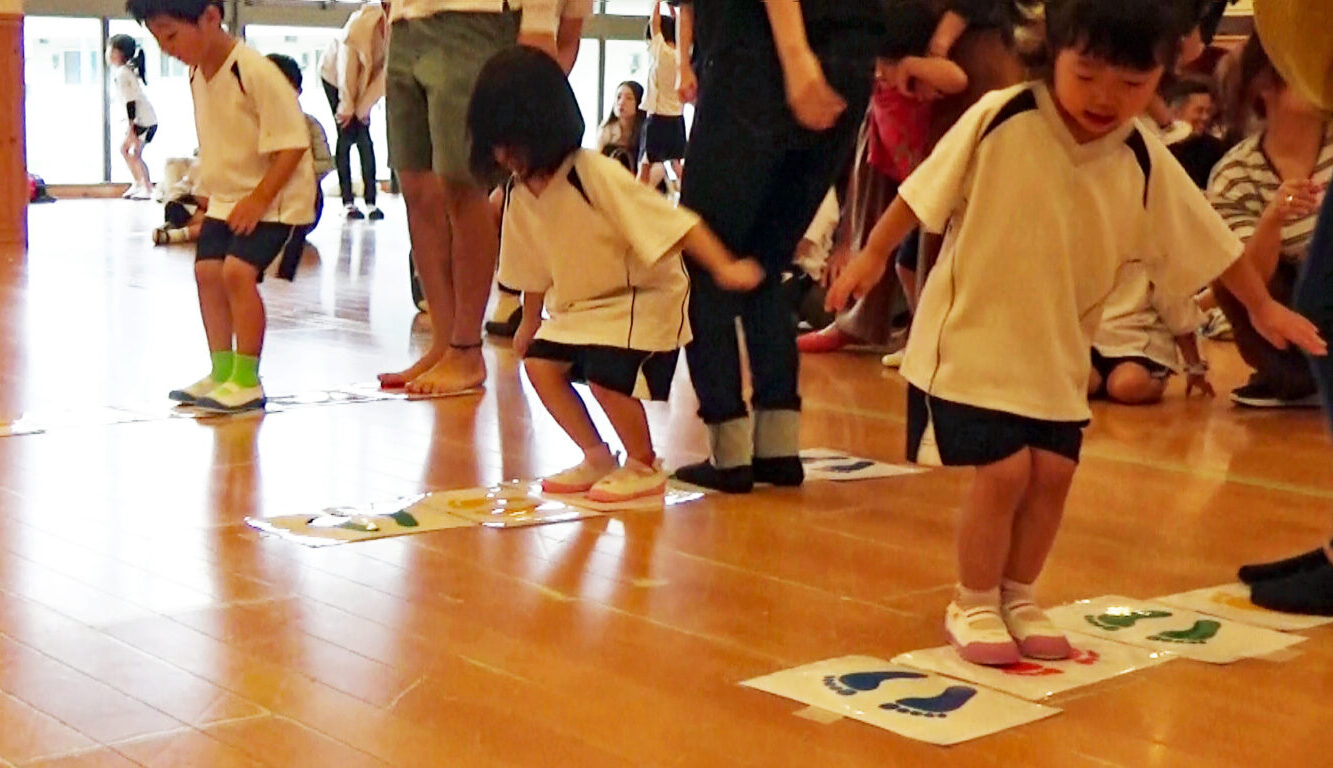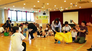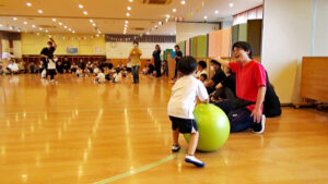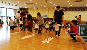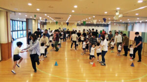 ホール内を広く有効に使えるように、そして親子が思いっきり体を動かして交流を深めることができるように、以上児3クラスを前半・後半の2パートに時間をずらして実施しました。