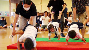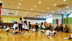 プログラムのラストはクラス対抗保護者競技「跳んしゃがんでタイムチャレンジ!」