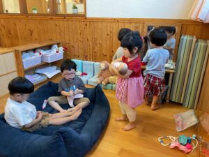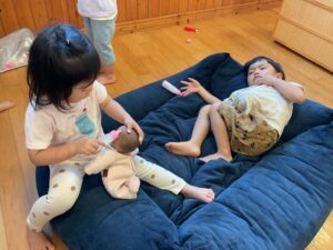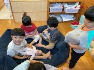 赤ちゃんごっこは、子どもたちにとって「まねっこ遊び」であると同時に、”人への思いやりや社会性の芽生え”を育む大切な遊びです。