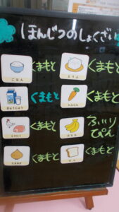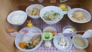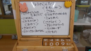 献立に変更があります。もも組の午後食がきなこサンドウィッチ、ヴィシソワーズに変わっています。
