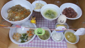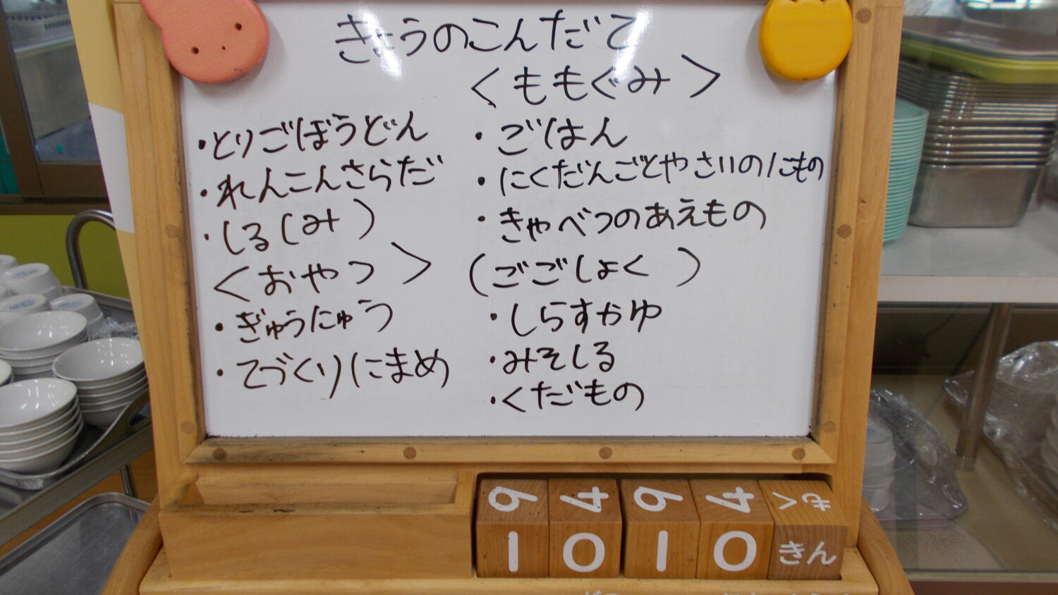 献立に変更があります。もも組の午前食が肉団子と野菜の煮物に変わっています。