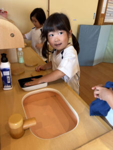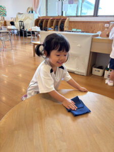 お皿を置く前に、ふきんでテーブルを拭き拭き✨