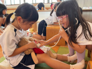 少人数から始まった病院ごっこでしたが盛り上がってきたので大きな病院スペースを作り、本格的に遊べるようにしました☺️