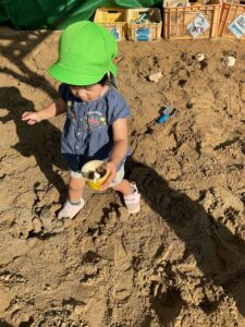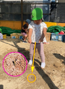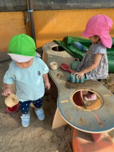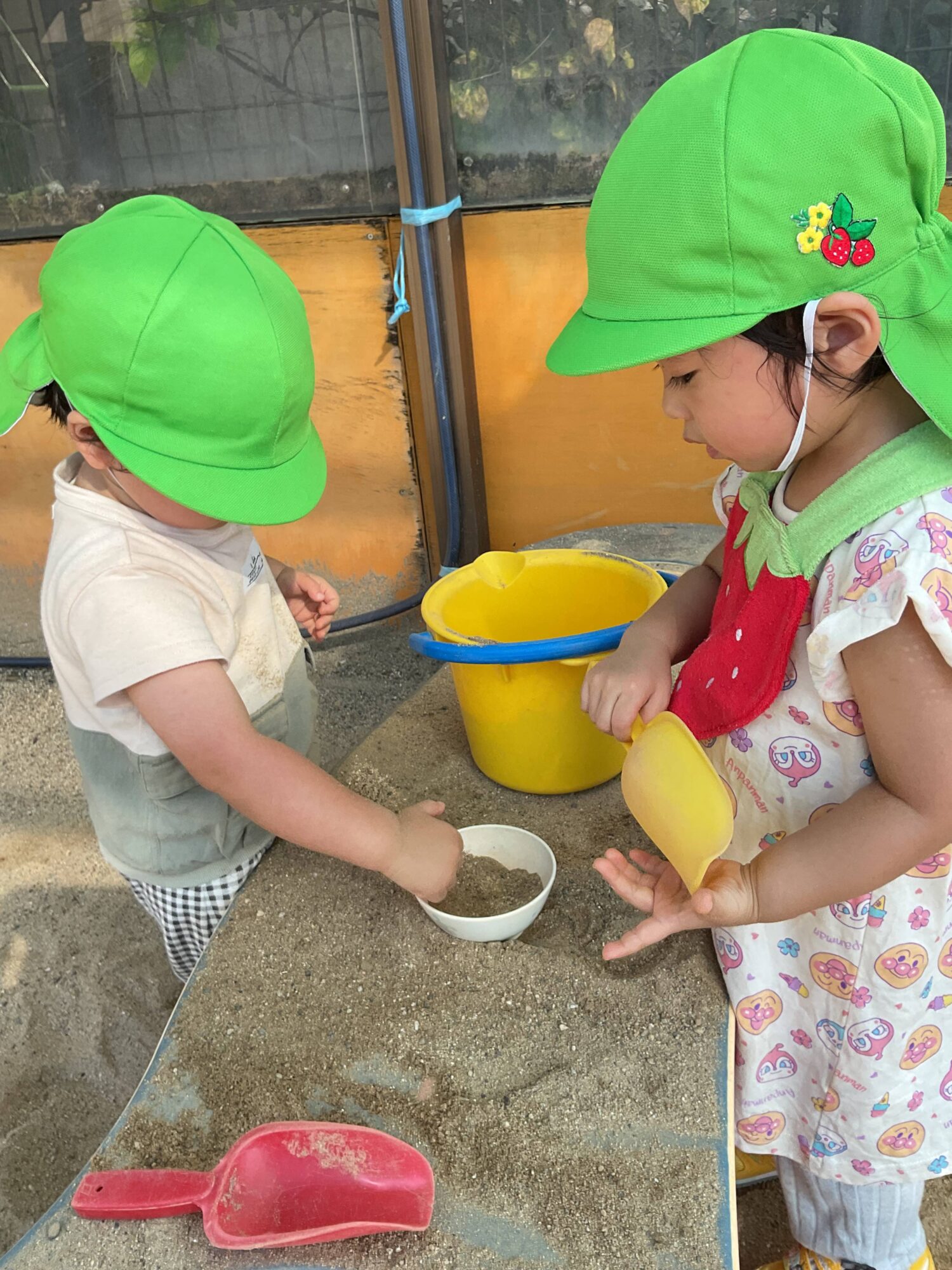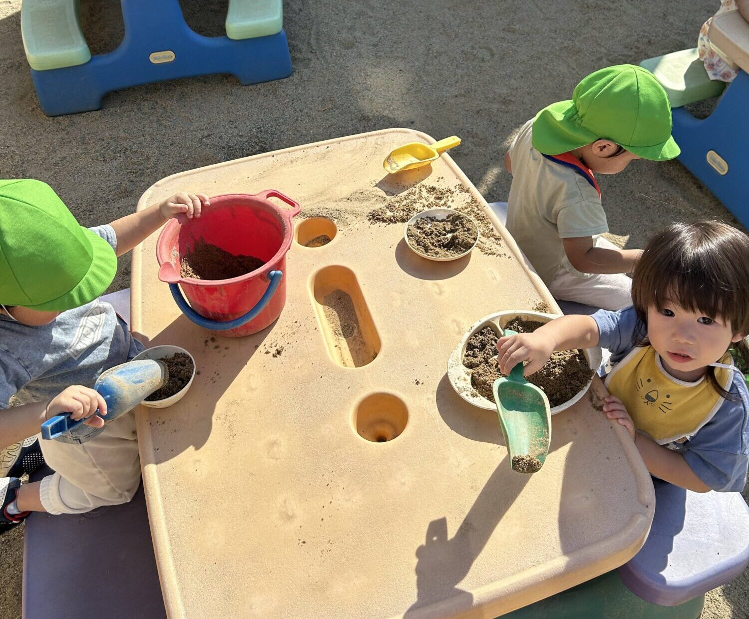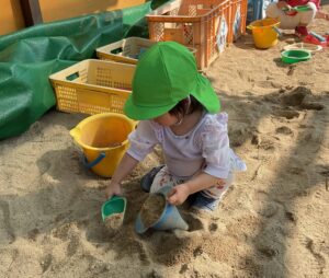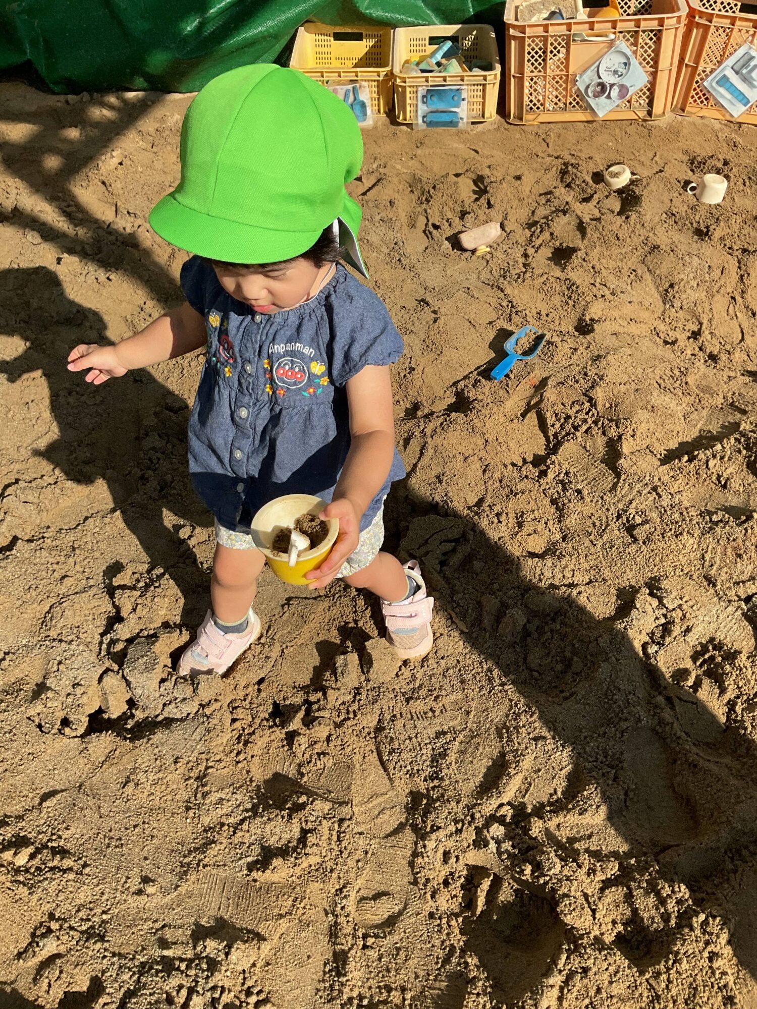真剣な表情で砂を混ぜる子、「カップがいっぱいになったー!」と嬉しそうに見せてくれる子、それぞれが思い思いに“作る楽しさ”を感じています。