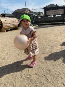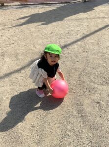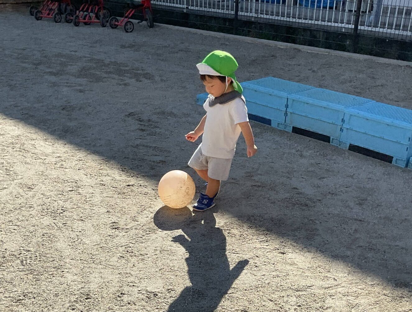 ボール遊びでは、自分の足で上手にけって追いかけたり、両手で転がして保育者にパスしたりする姿が見られました。