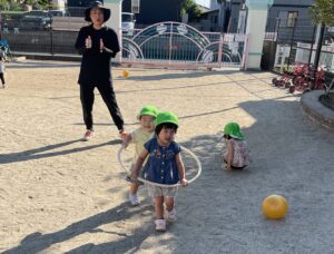フープ遊びでは、お友だちと一緒にフープの中に入って歩いたり、電車ごっこのように連なって「しゅっぱ~つ!」と楽しむ姿もありました。