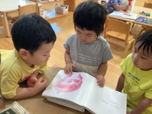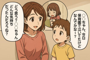 絵本を読んだあとに「この子はどうして泣いているのかな?」と友だちと話し合う場面など…