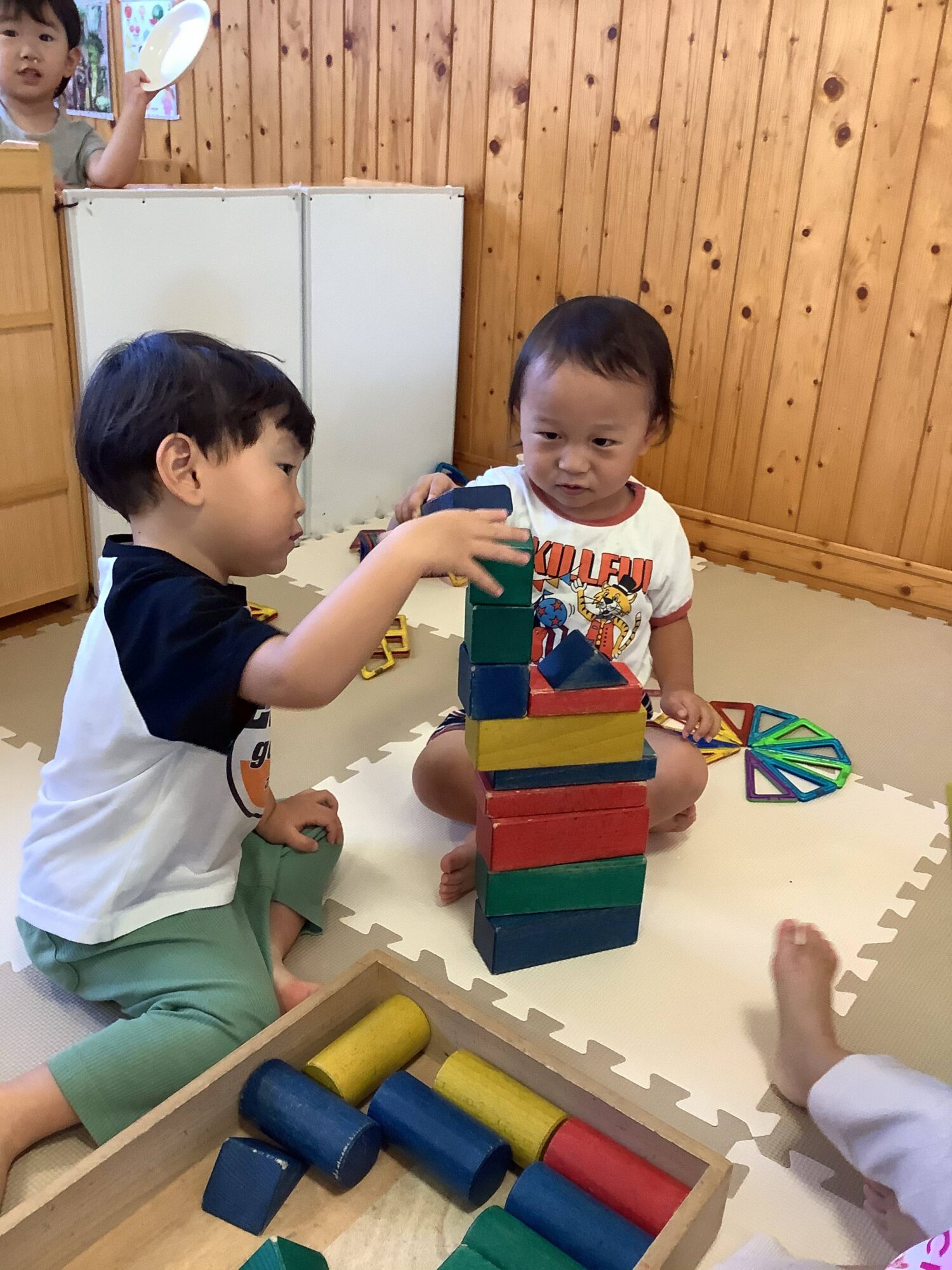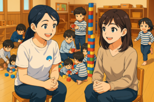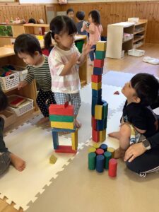 例えば、ブロック遊びで高く積み上げていく中で「どうすれば倒れないかな?」「この形にしたら安定するかも」と試行錯誤する姿や…