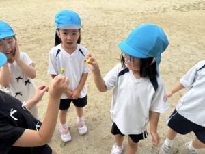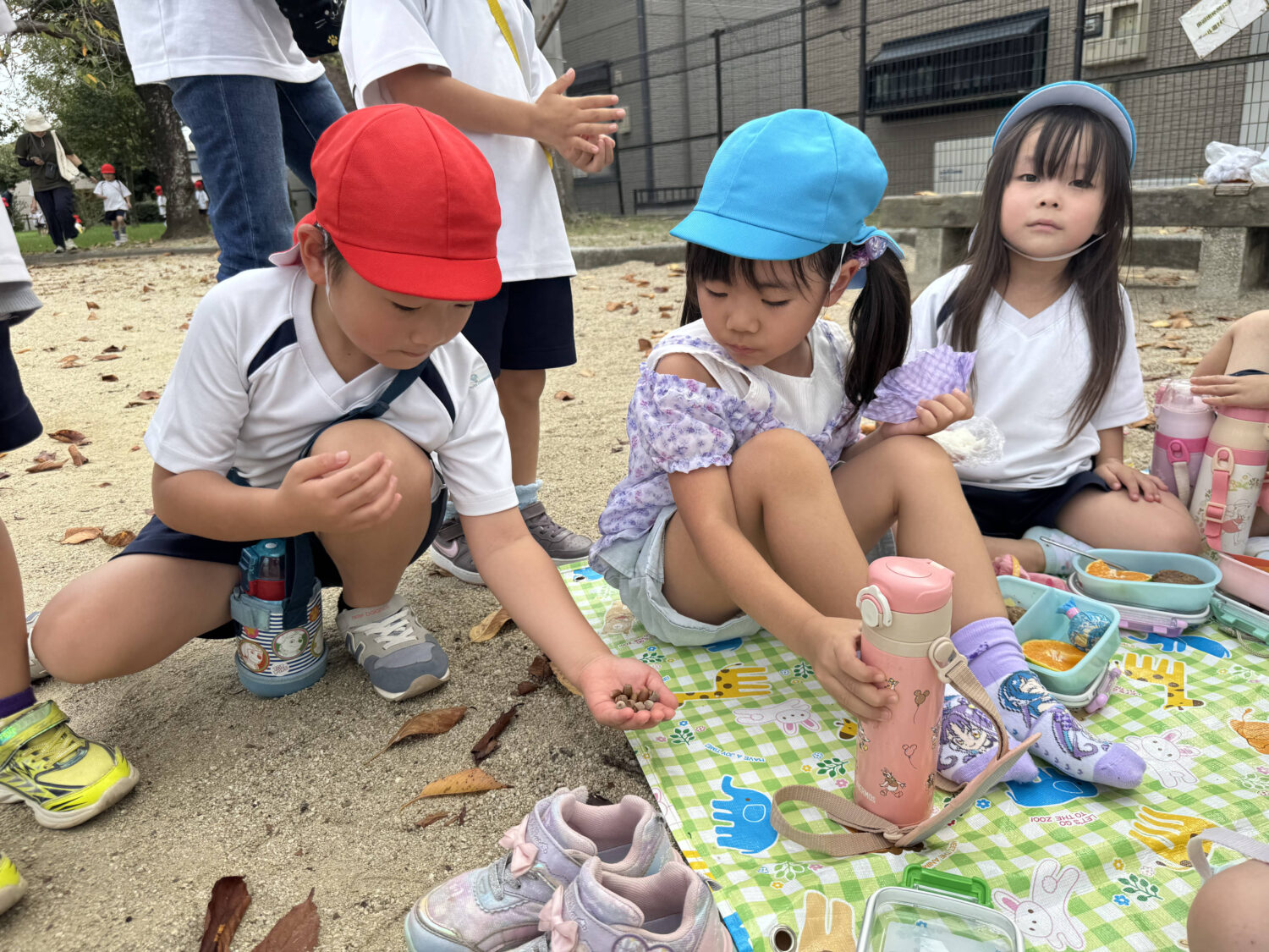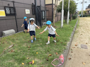 秋探しで公園に遊びに来ていたゆり組さんにも会い、どんぐりの木があることを教えてもらったばら組さん!