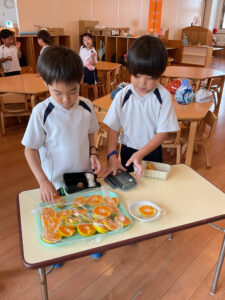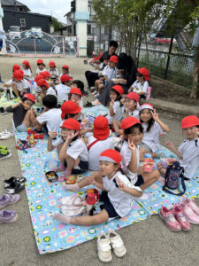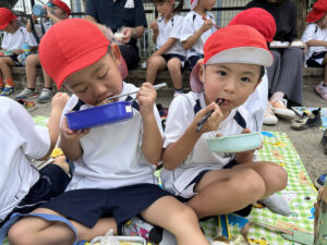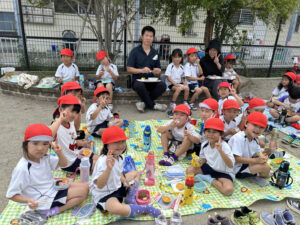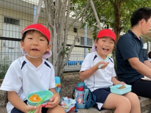 園庭にシートを敷いて、ピクニック気分で”いただきま~す!”