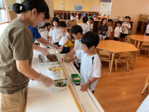 この日は「保育参加」でお父さん、お母さんも来られていたので一緒に食べました。
