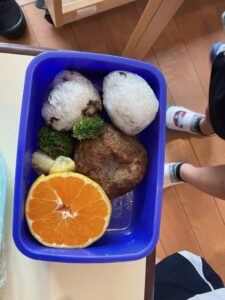 この日のメニューは照り焼きハンバーグ、ブロッコリー、粉ふき芋、みかんでした😋