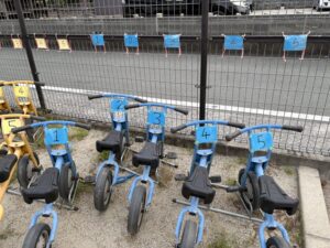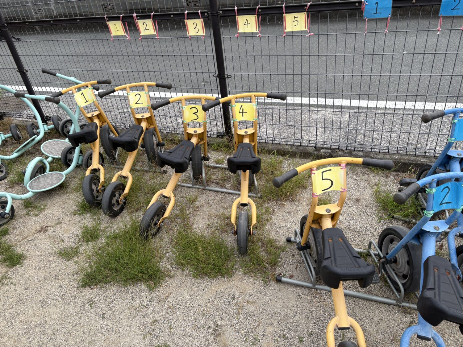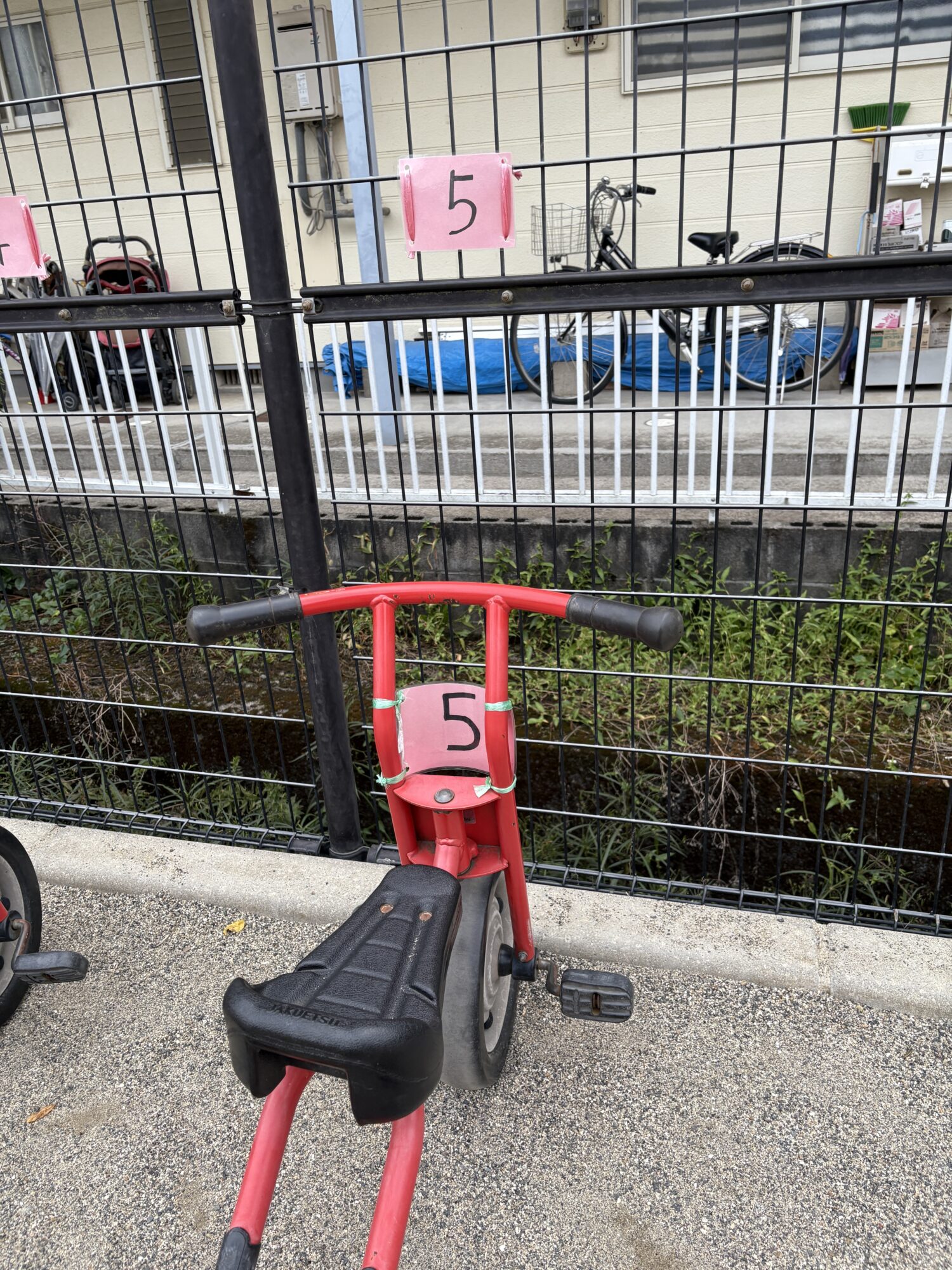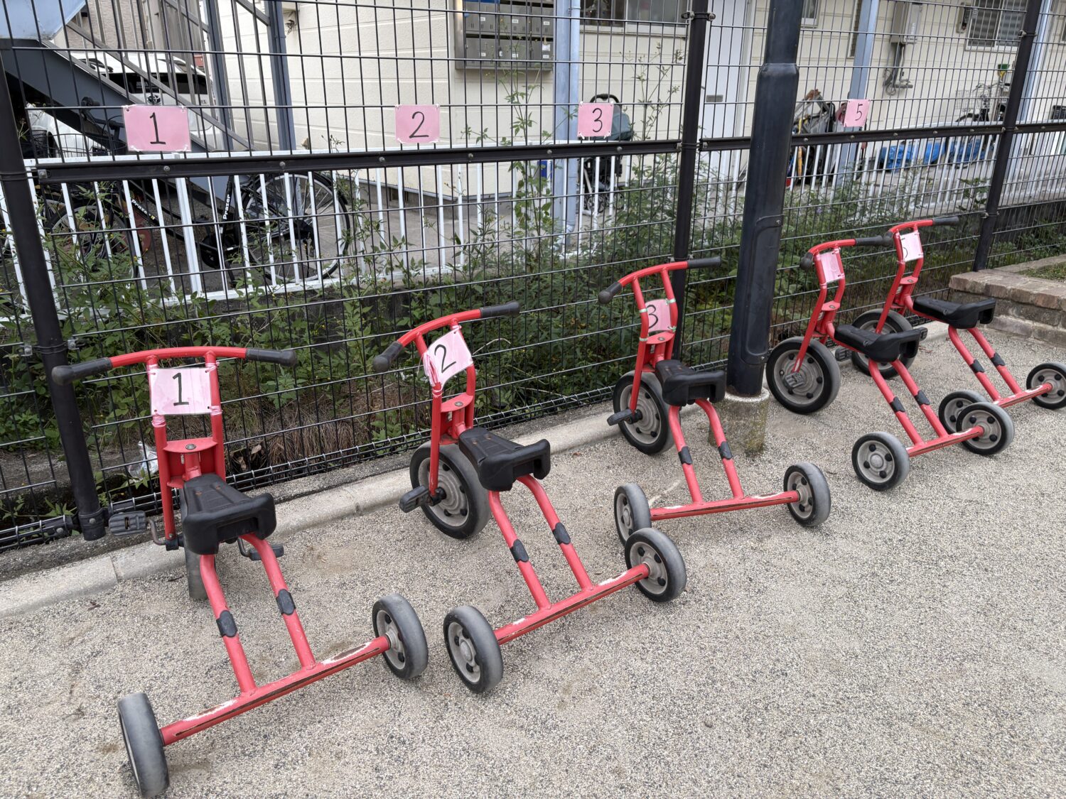この数字は、三輪車を使い終わった後、子ども達が元の場所に戻せるように数字をマッチングさせたものです。