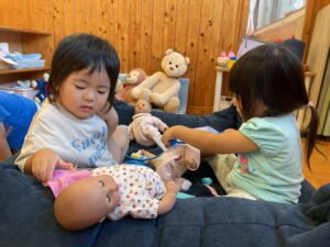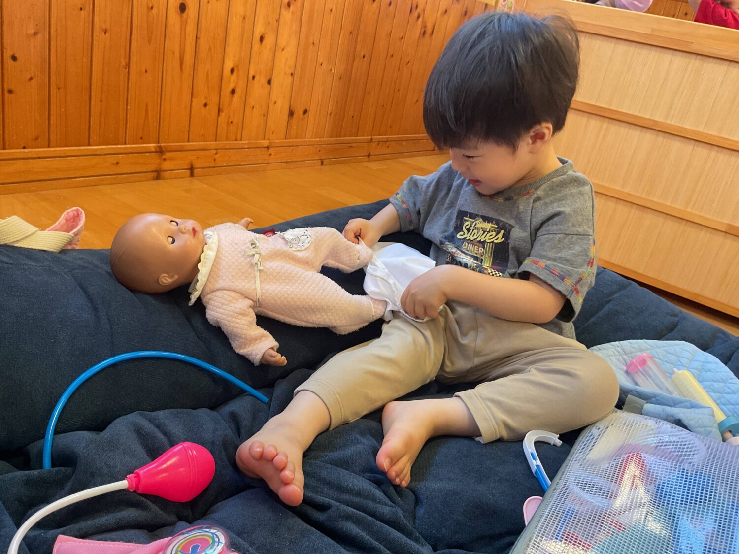 お気に入りの赤ちゃん人形を大事そうに抱えて、「うんちが出ちゃった!」「お熱かな?」と、自然と優しい言葉が飛び交います。