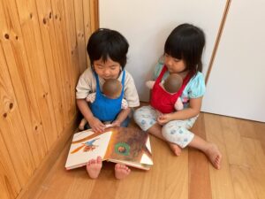 2人並んで赤ちゃんを抱きながら絵本を読む姿は、まるで本当のお母さんたちのよう。