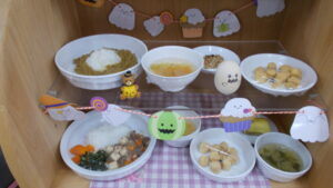 ドライカレーには合挽肉、玉ねぎ、人参、ピーマン、ミックスビーンズ、レーズン、コーンの食材を使用しています。食材は全てみじん切りにしているので食べやすく、レーズンの甘みがあり美味しかったです。