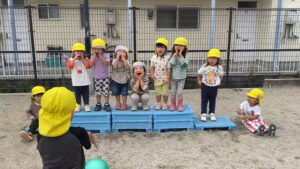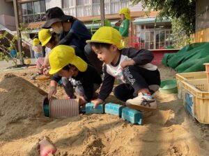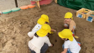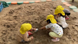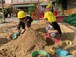 砂場遊びでは、みんなで一緒にお山づくりをしています。