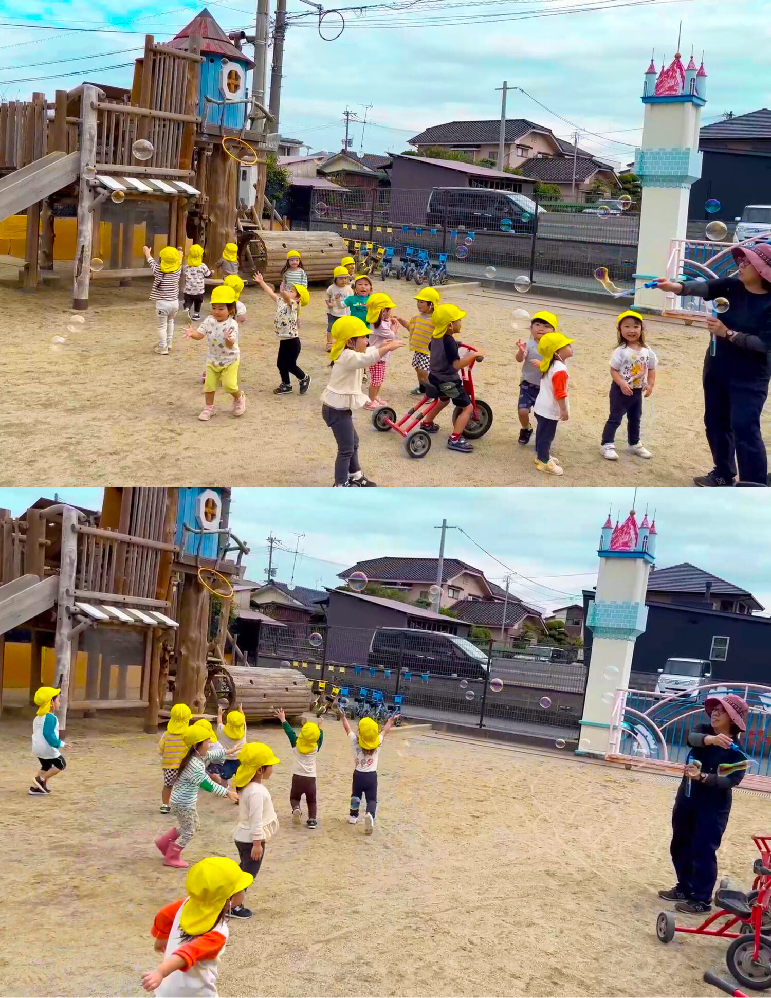 シャボン玉遊び…保育者が作るシャボン玉を嬉々として追いかける子ども達。