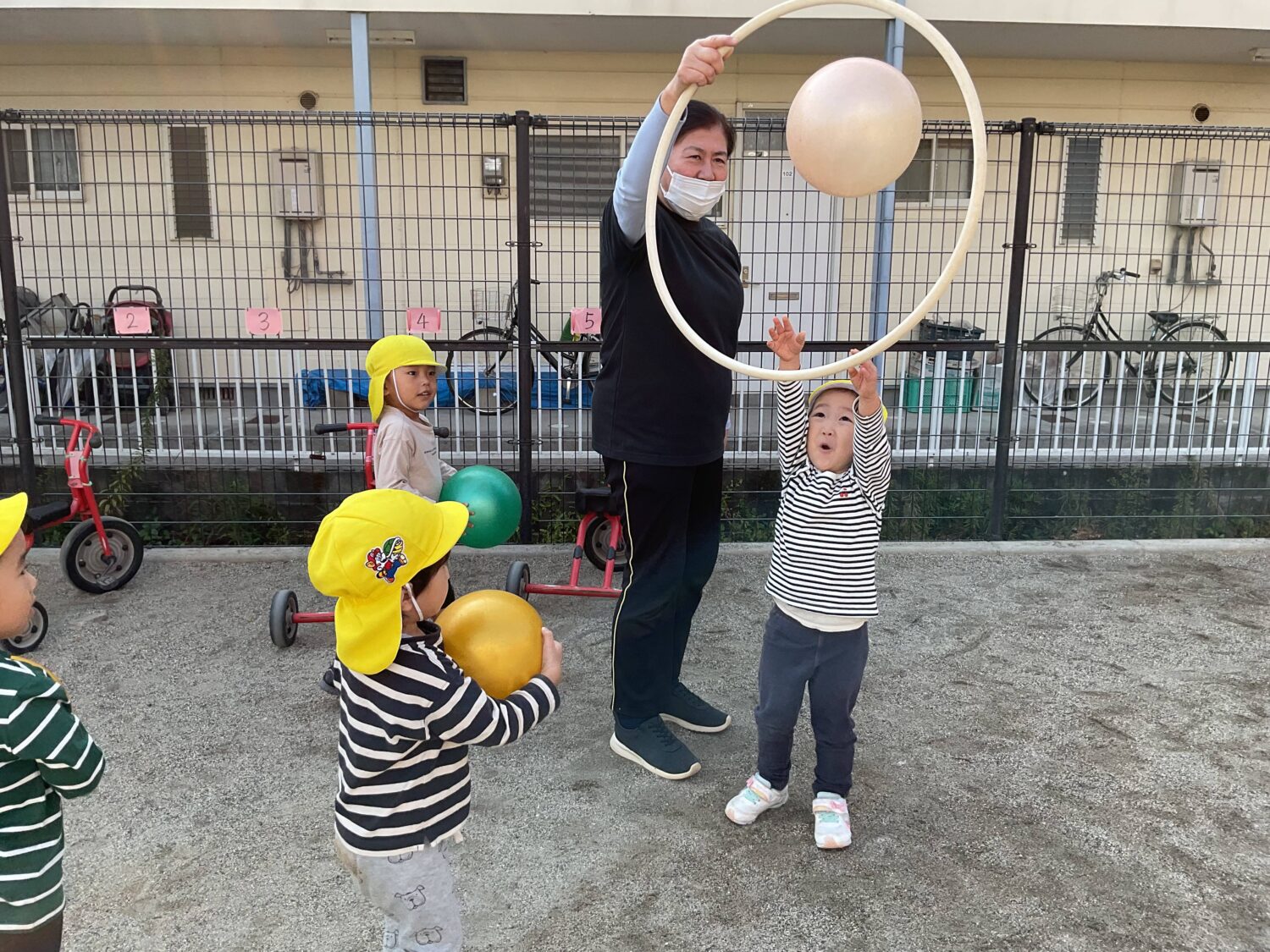 保育者が持ったフープの中にボールを入れるゲーム🏀