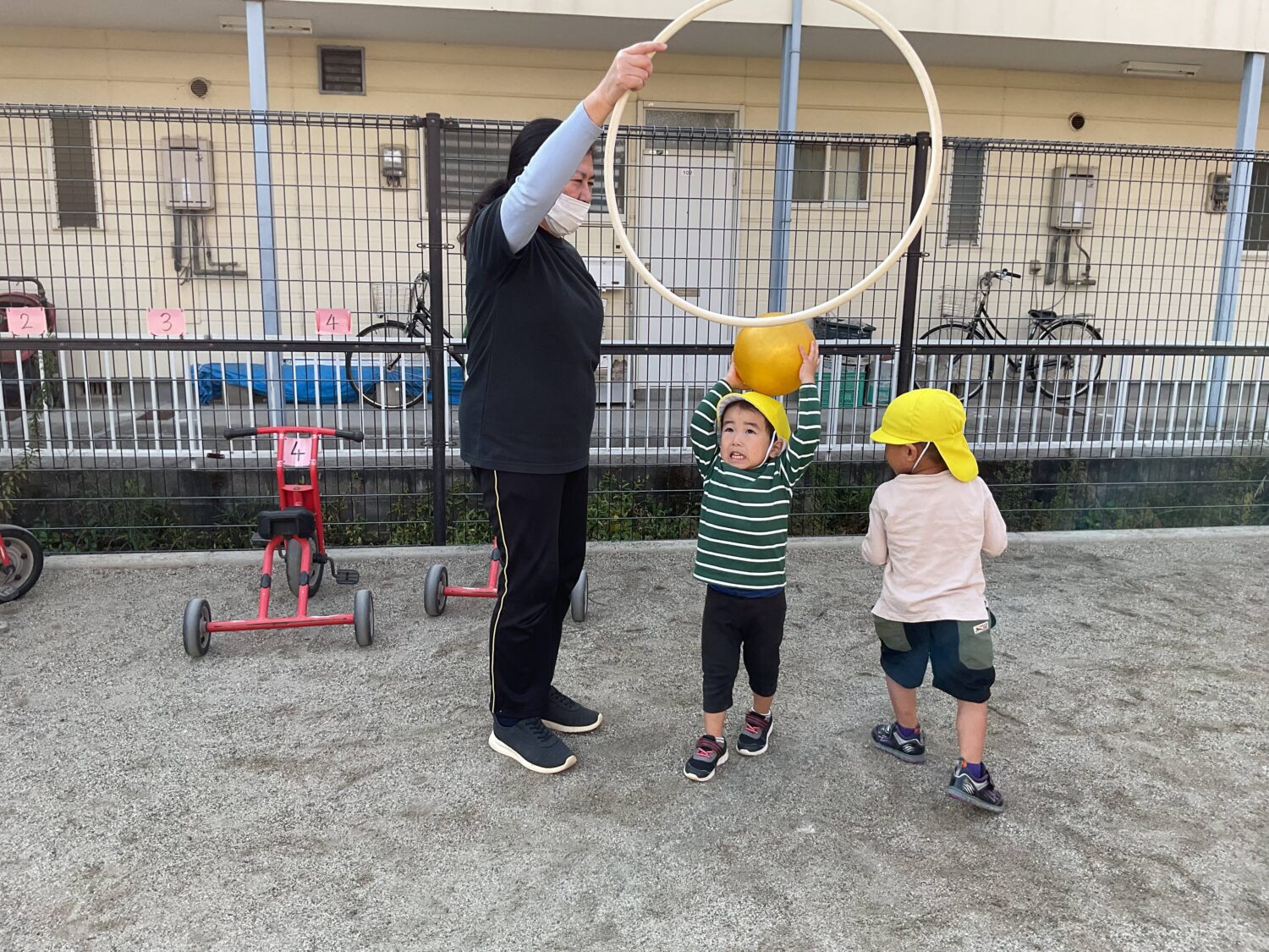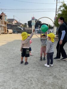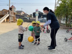 保育者と一緒にフープを持ってくれるお友だちも登場!