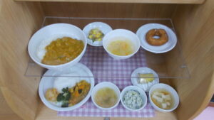 手作りドーナツはミックス粉、卵、牛乳を混ぜたものをドーナツの型をとって油で揚げ、砂糖をまぶしています。外はサクサク中はふんわりとしていてみんなよく食べてくれました。