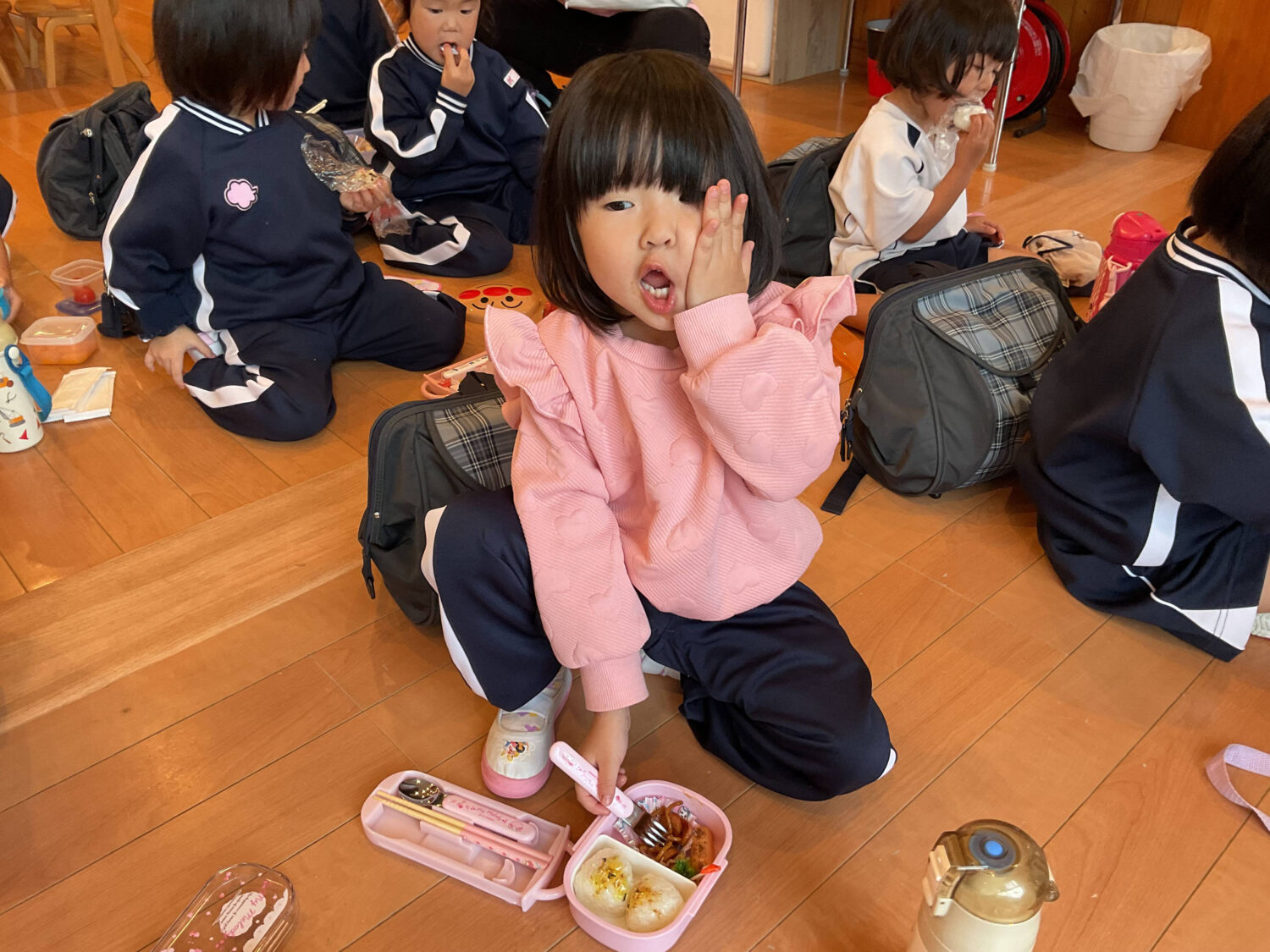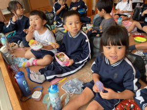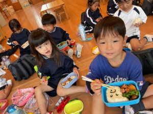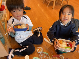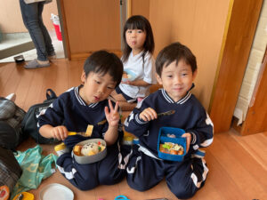 お家の人が作ってくださったお弁当をお友だちと嬉しそうに見せ合いながら、楽しくいただきました。
