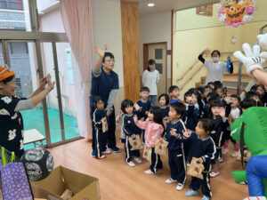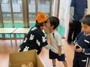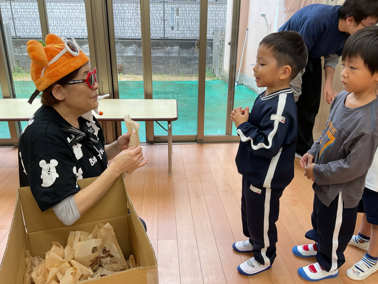 「トリックオアトリート!」の合言葉をみんなで練習して、お菓子をもらいに行きました!