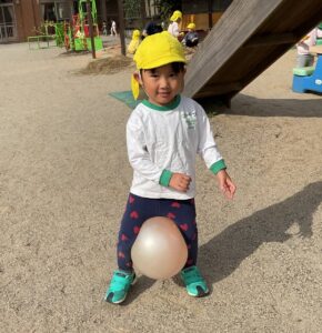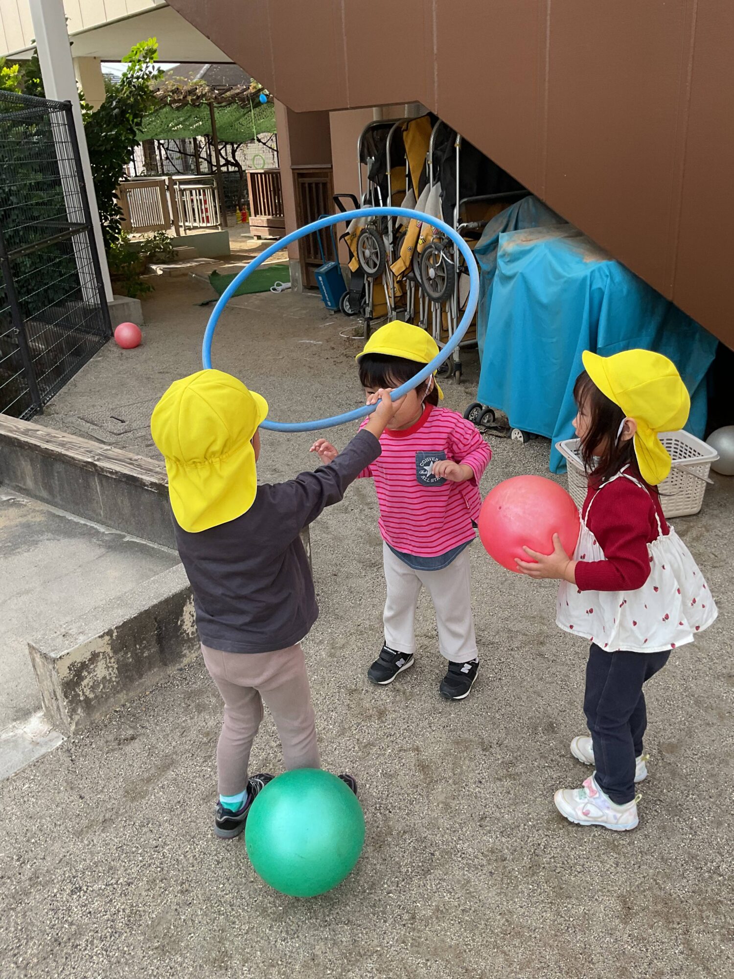 「これで遊ぼう👦🏻おもしろいよ!」とフープを持ち出して声をかけ合う姿も見られます。
