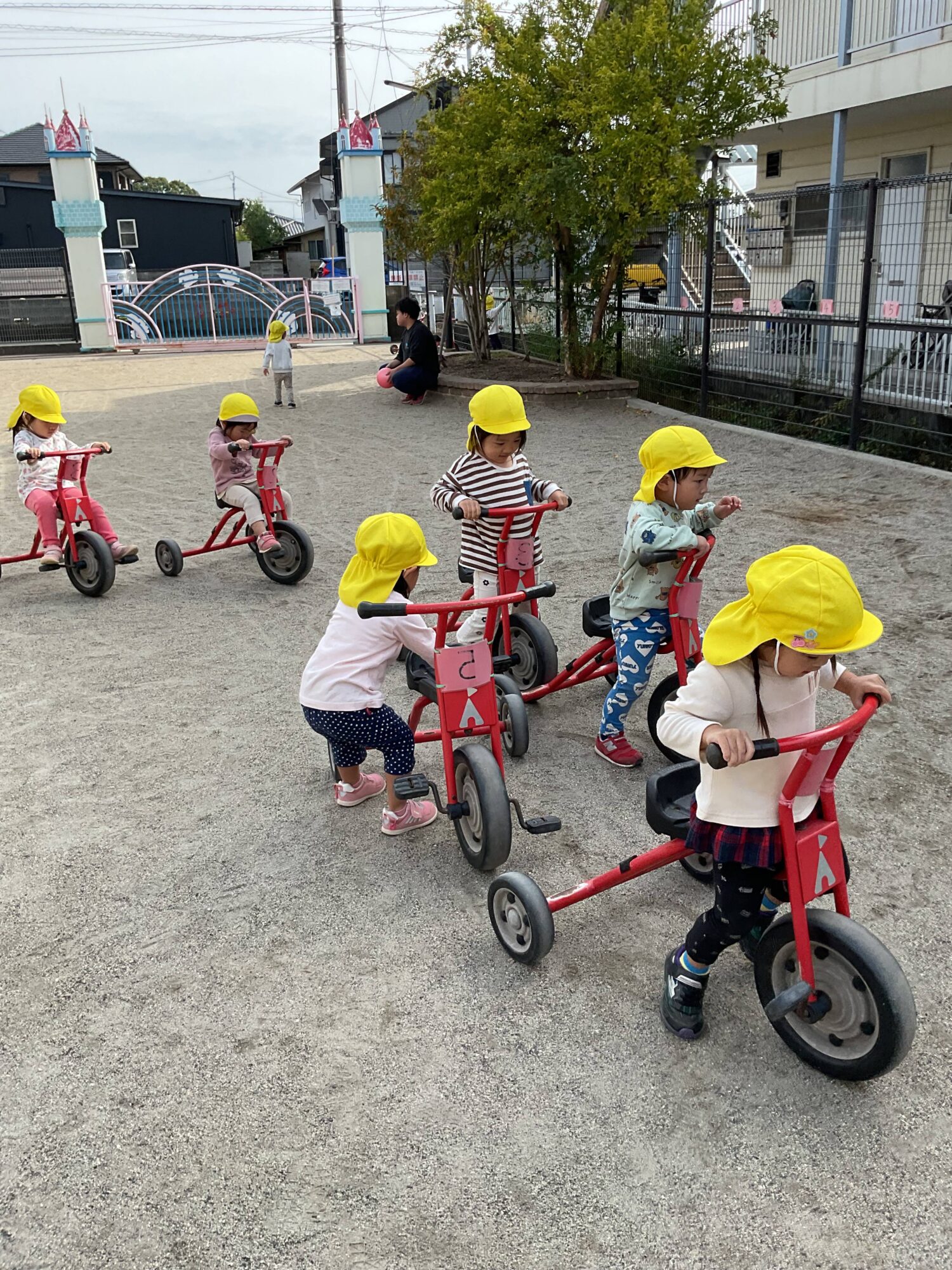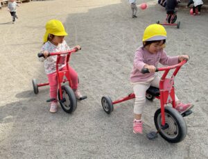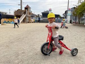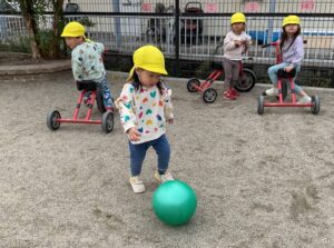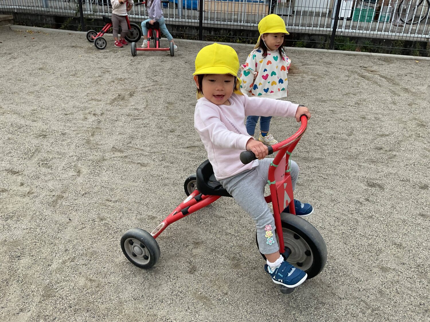 園庭に出ると、まず目に入るのはお気に入りの三輪車。