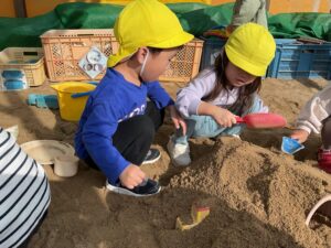 園庭の木々も少しずつ色づき、子どもたちは落ち葉や木の実を見つけては笑顔いっぱいに遊んでいます。
