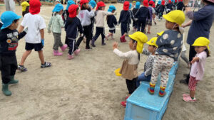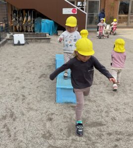 お友だちの姿を見て「つぎはぼく!」「じょうずだね」と声をかけ合う姿も見られ、仲間との関わりも深まっていきます。