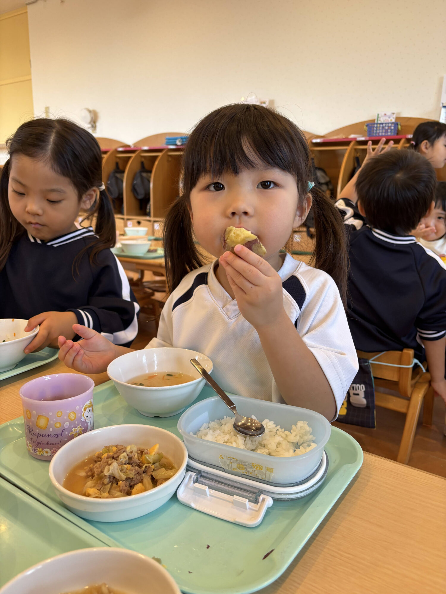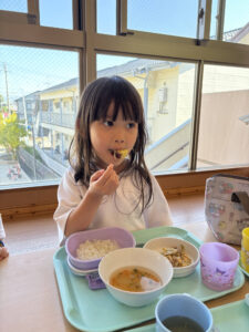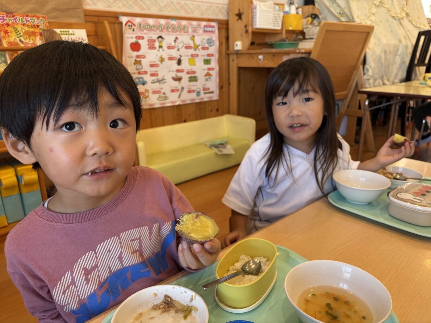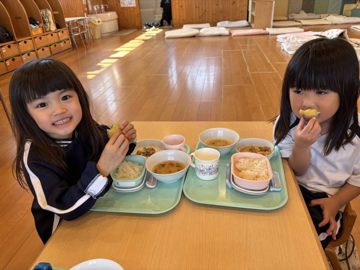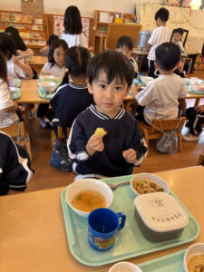 収穫したお芋はふかし芋として給食に登場し、「おいしい♪」と嬉しそうに頬張る子ども達の姿が見られました🎶