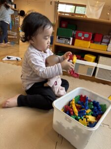 赤ちゃんにブロックでオモチャを作ってあげているのかな❓✨