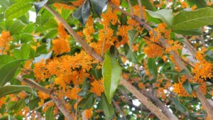 花壇にはキンモクセイの花がビッシリ降り積もっています。