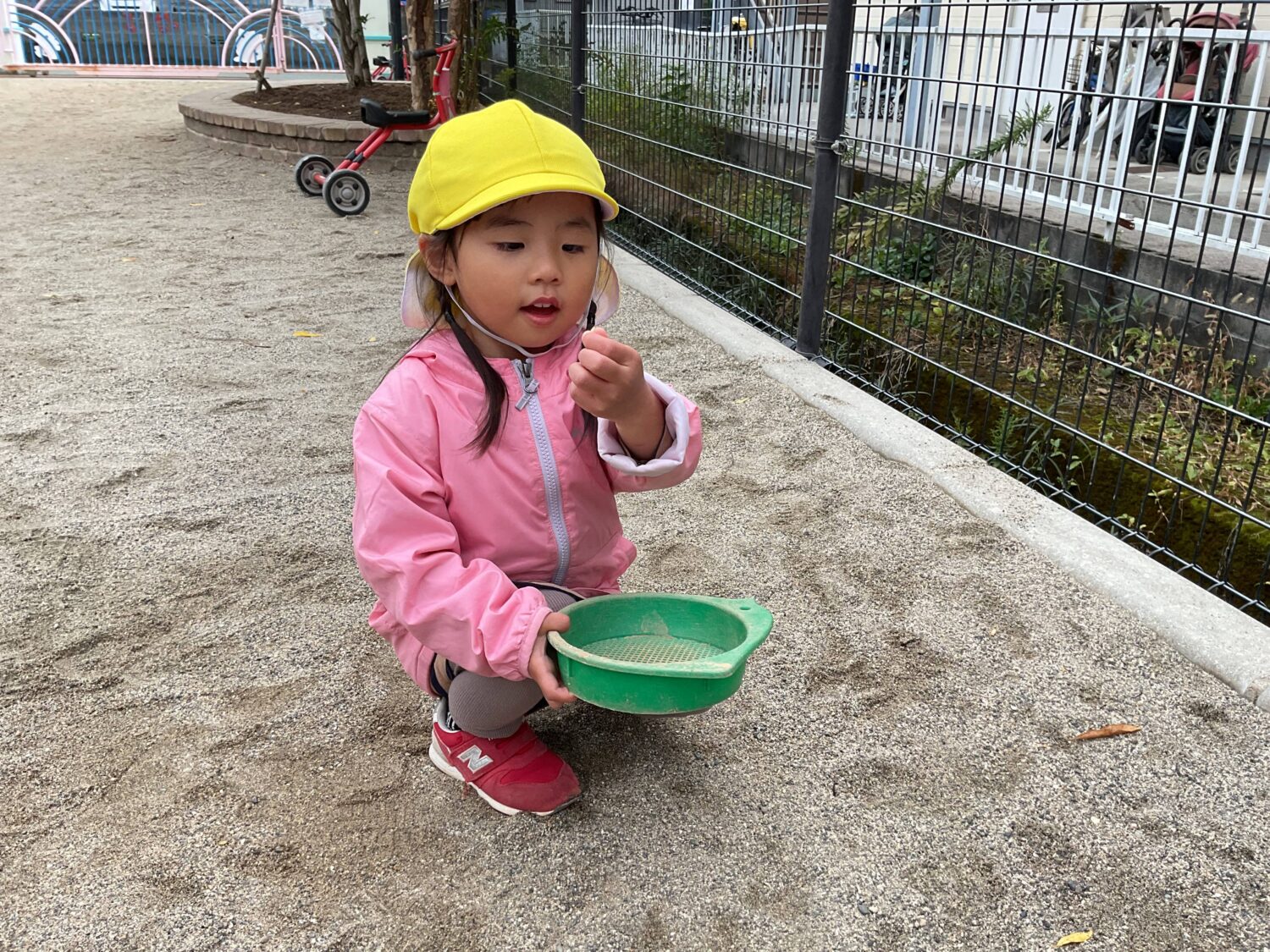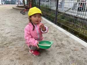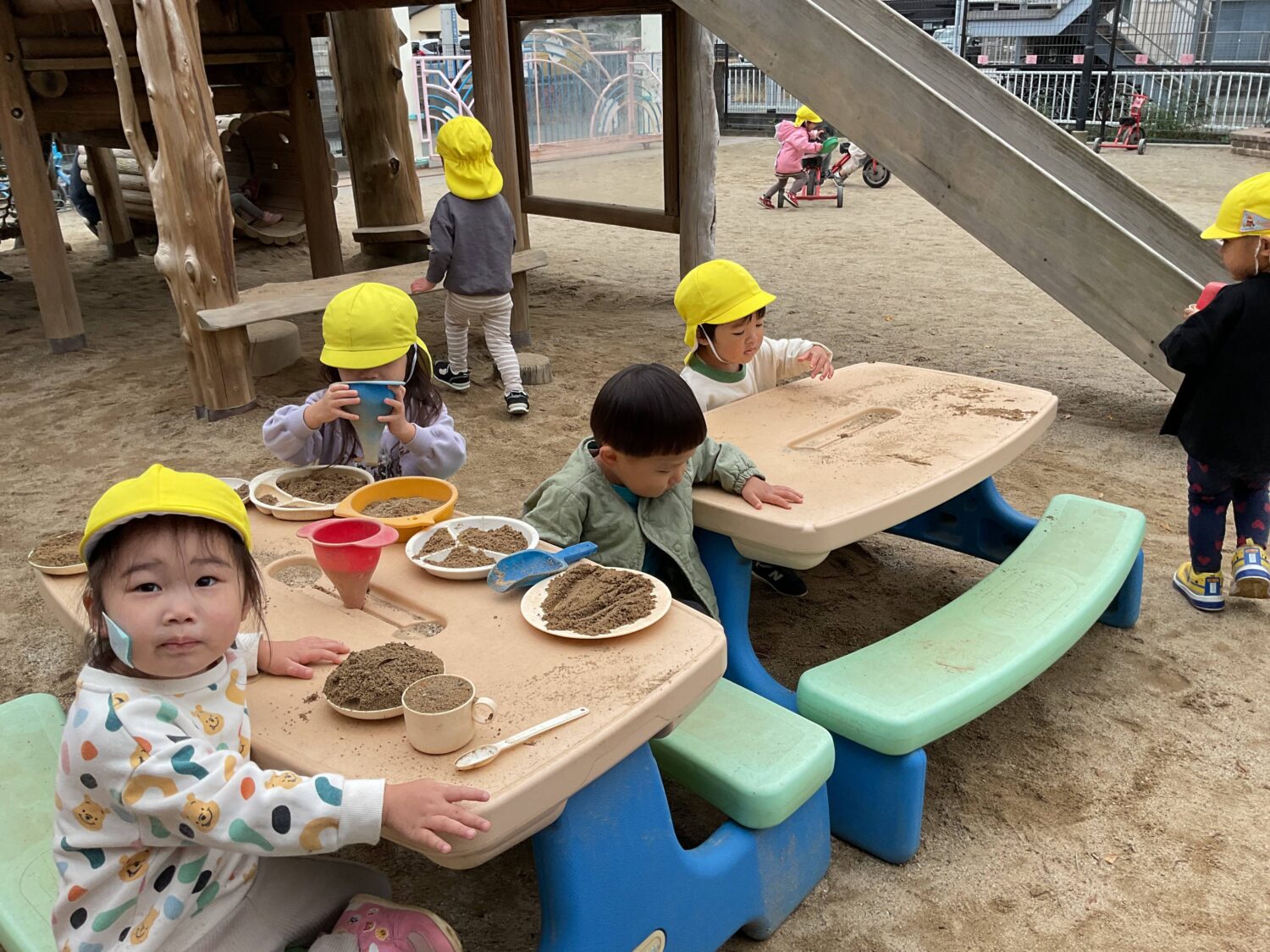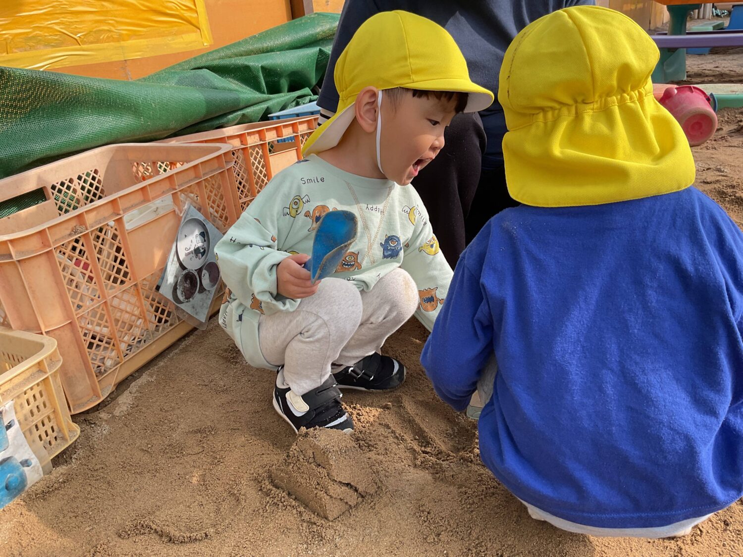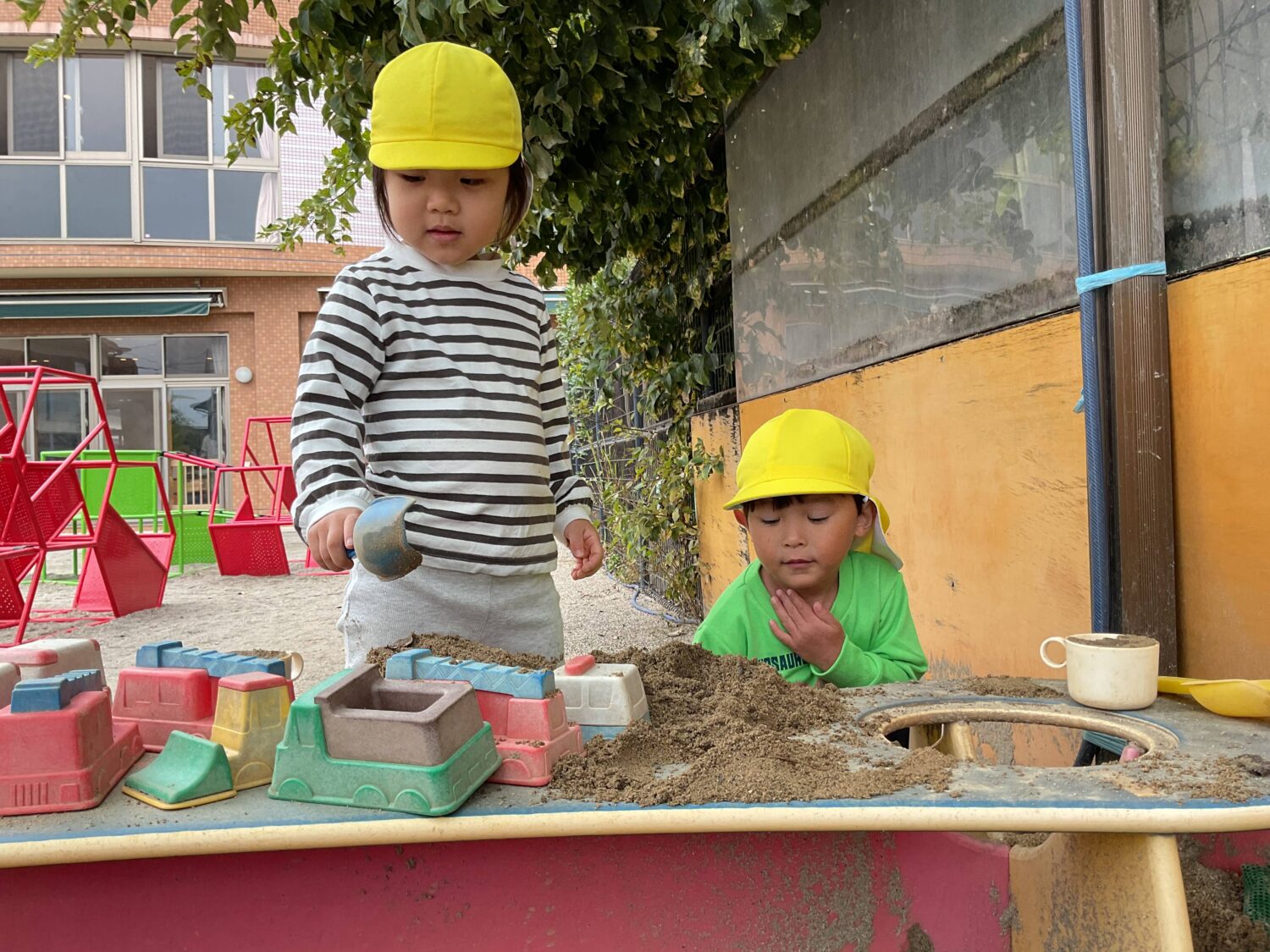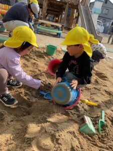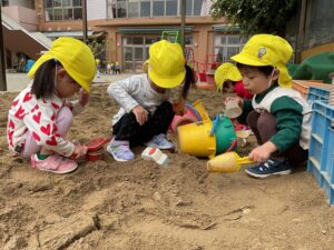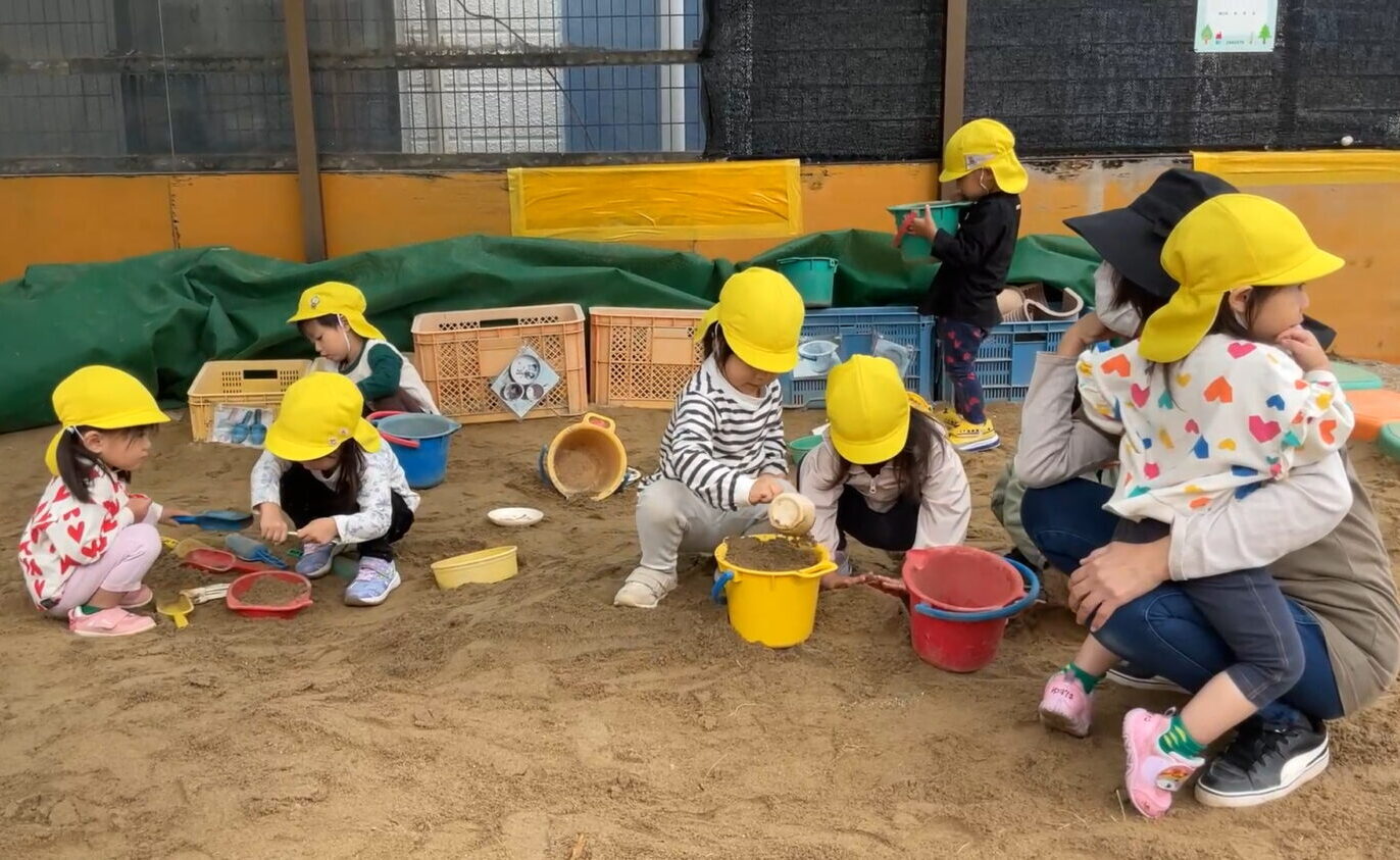 園庭では、子どもたちが砂遊びに夢中になっています。