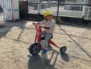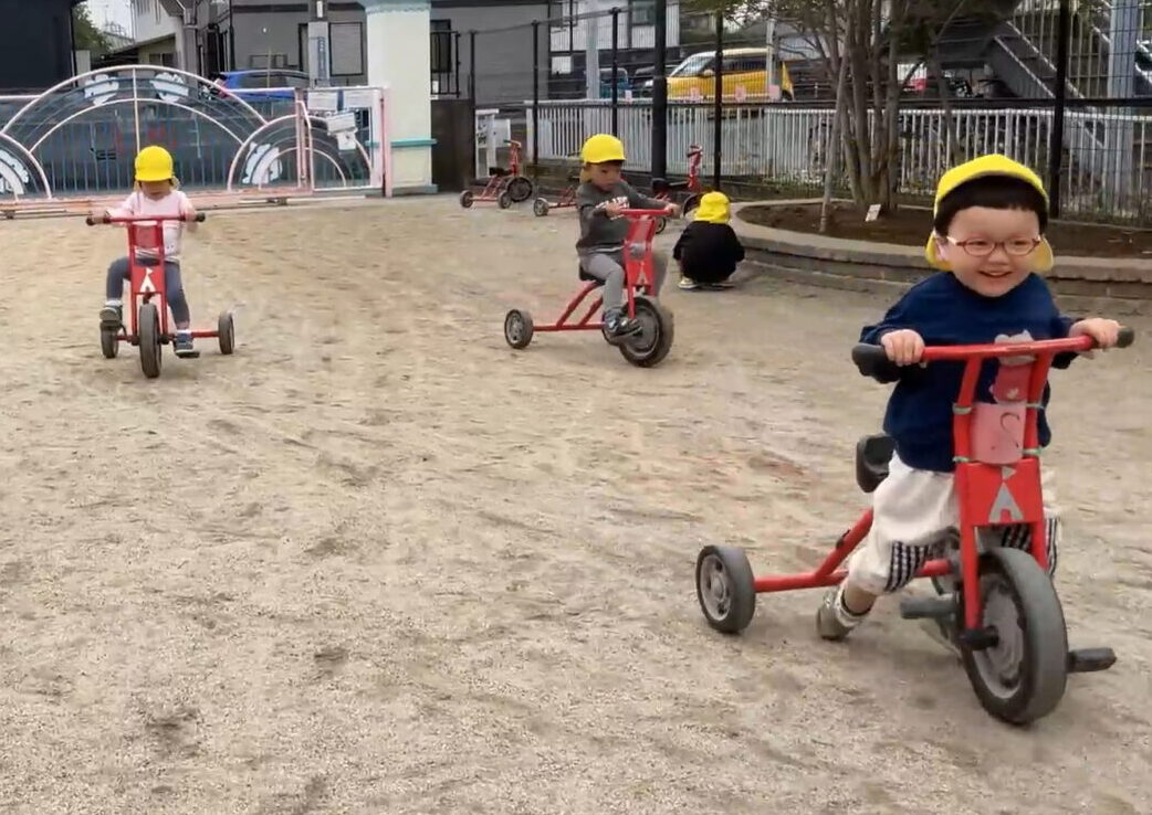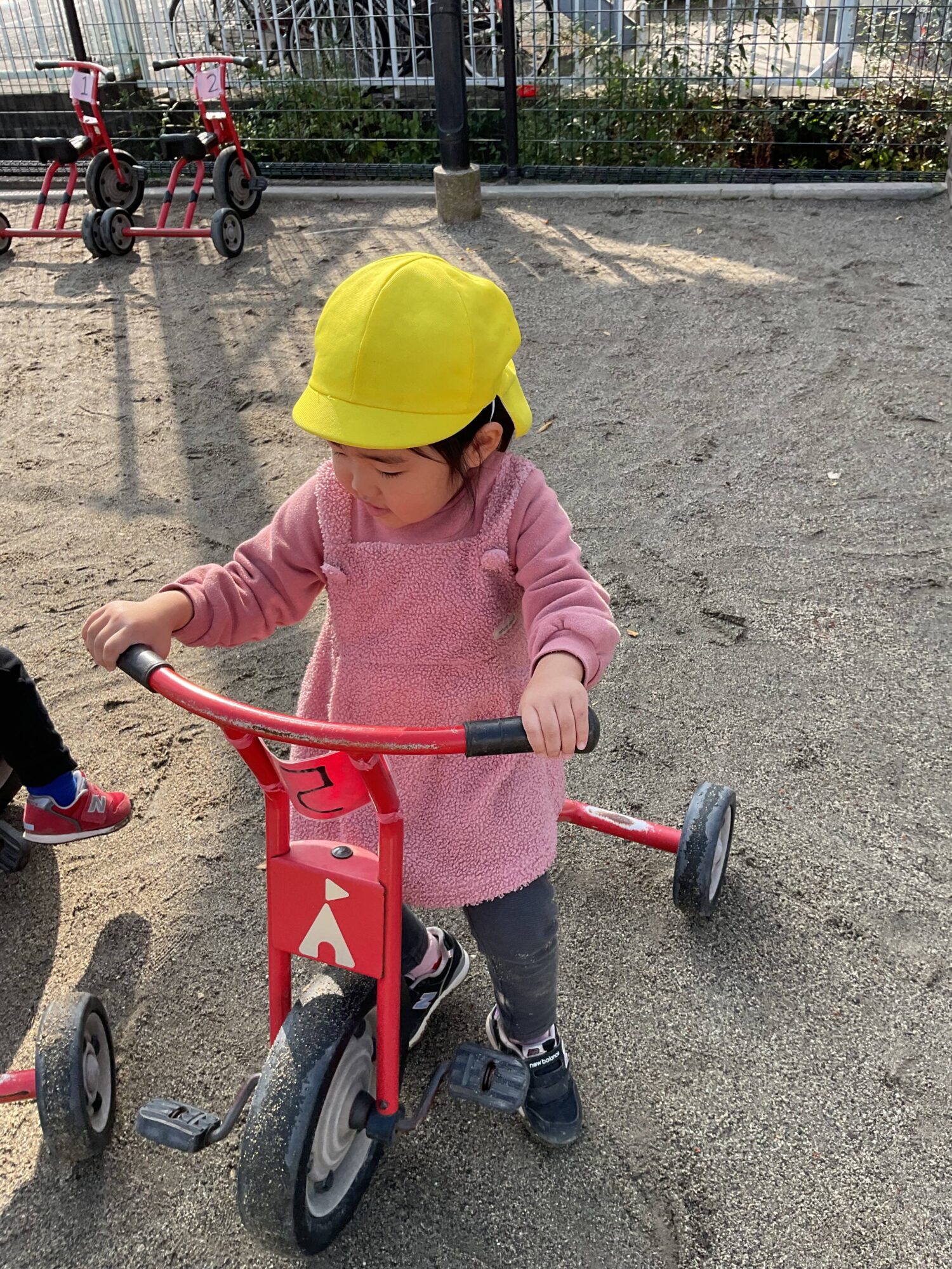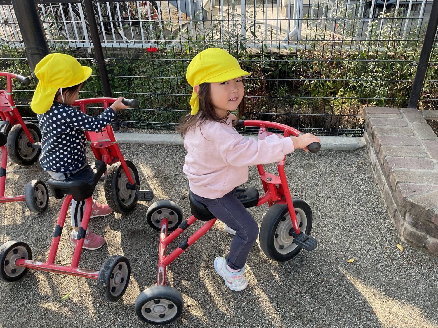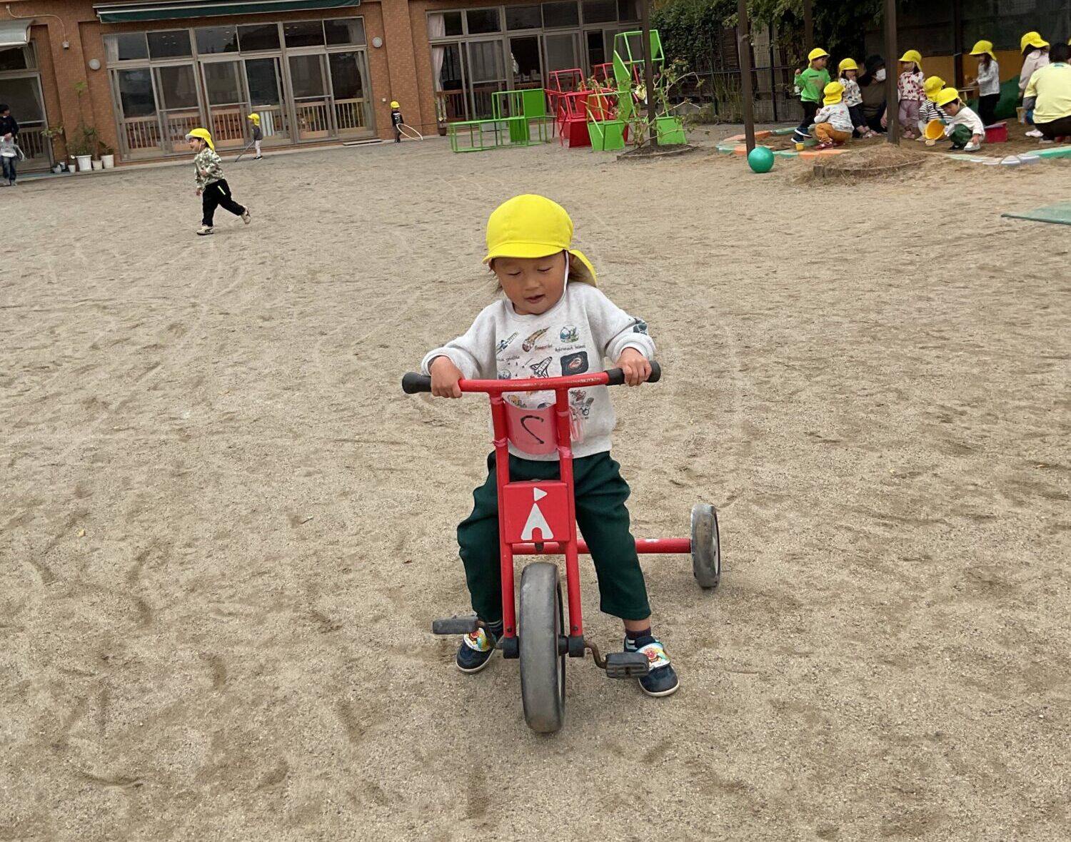 それぞれが赤い三輪車にまたがり、「よーいどん!」の声に合わせて力いっぱいペダルをこいだり、風を感じながら園庭を駆け抜けたりしています。