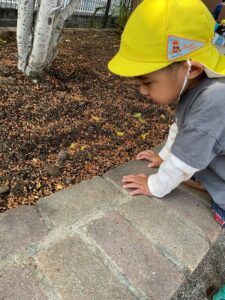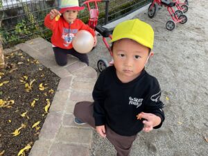 秋になるといろんな落ち葉や木の実などもたくさん落ちてきて、子ども達はよくおままごとに使って遊んでいます。