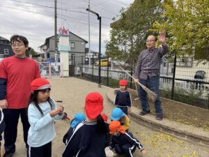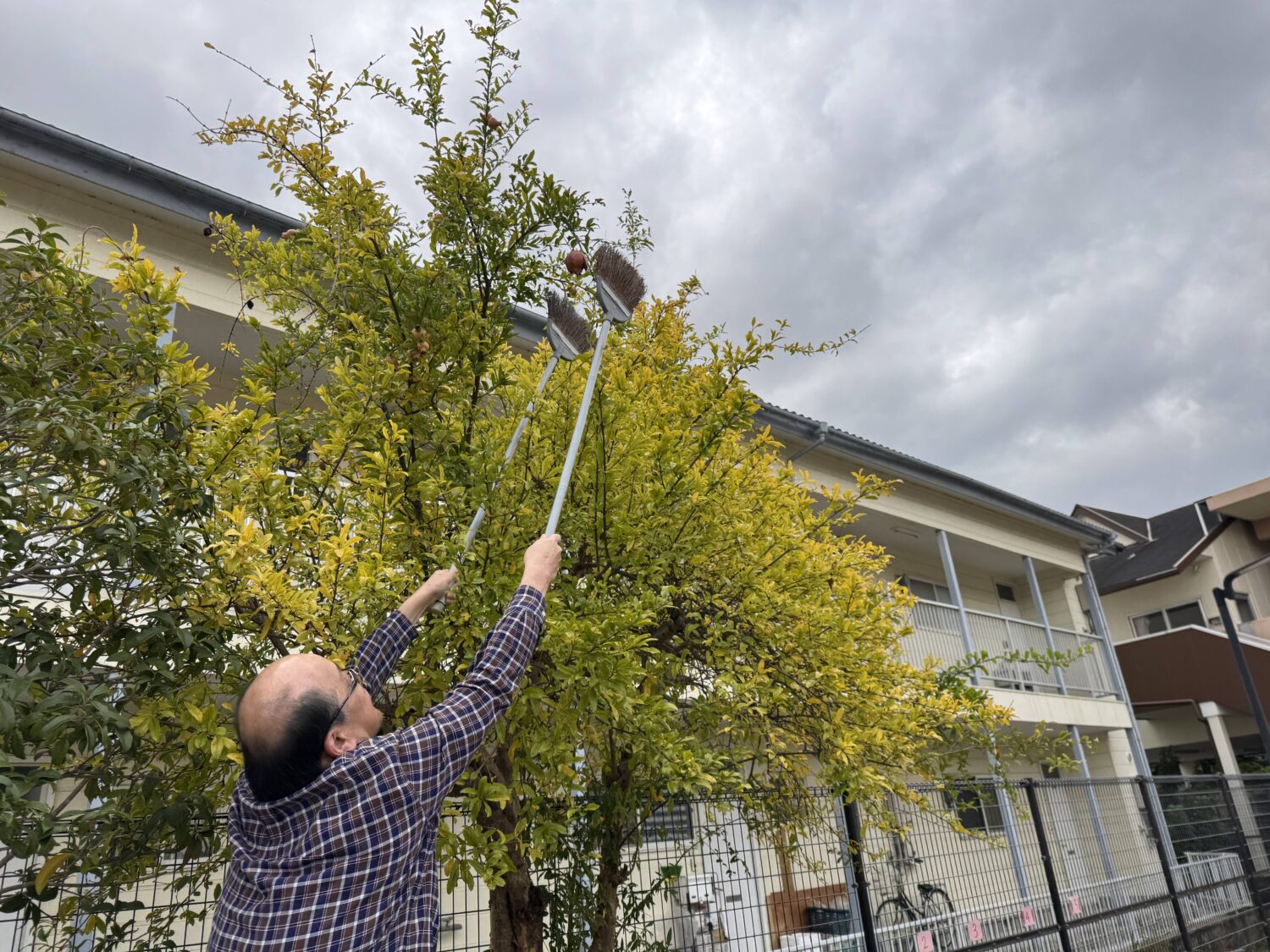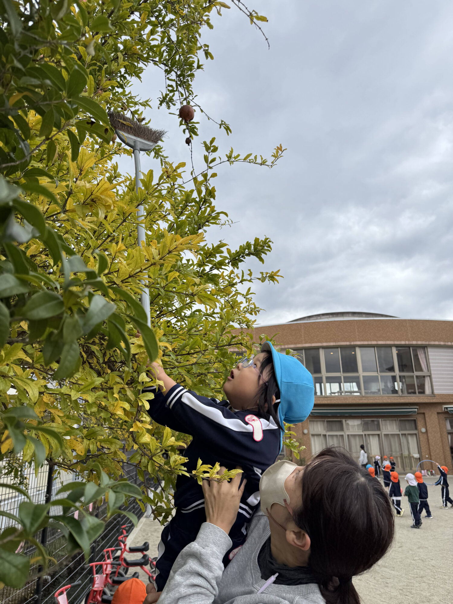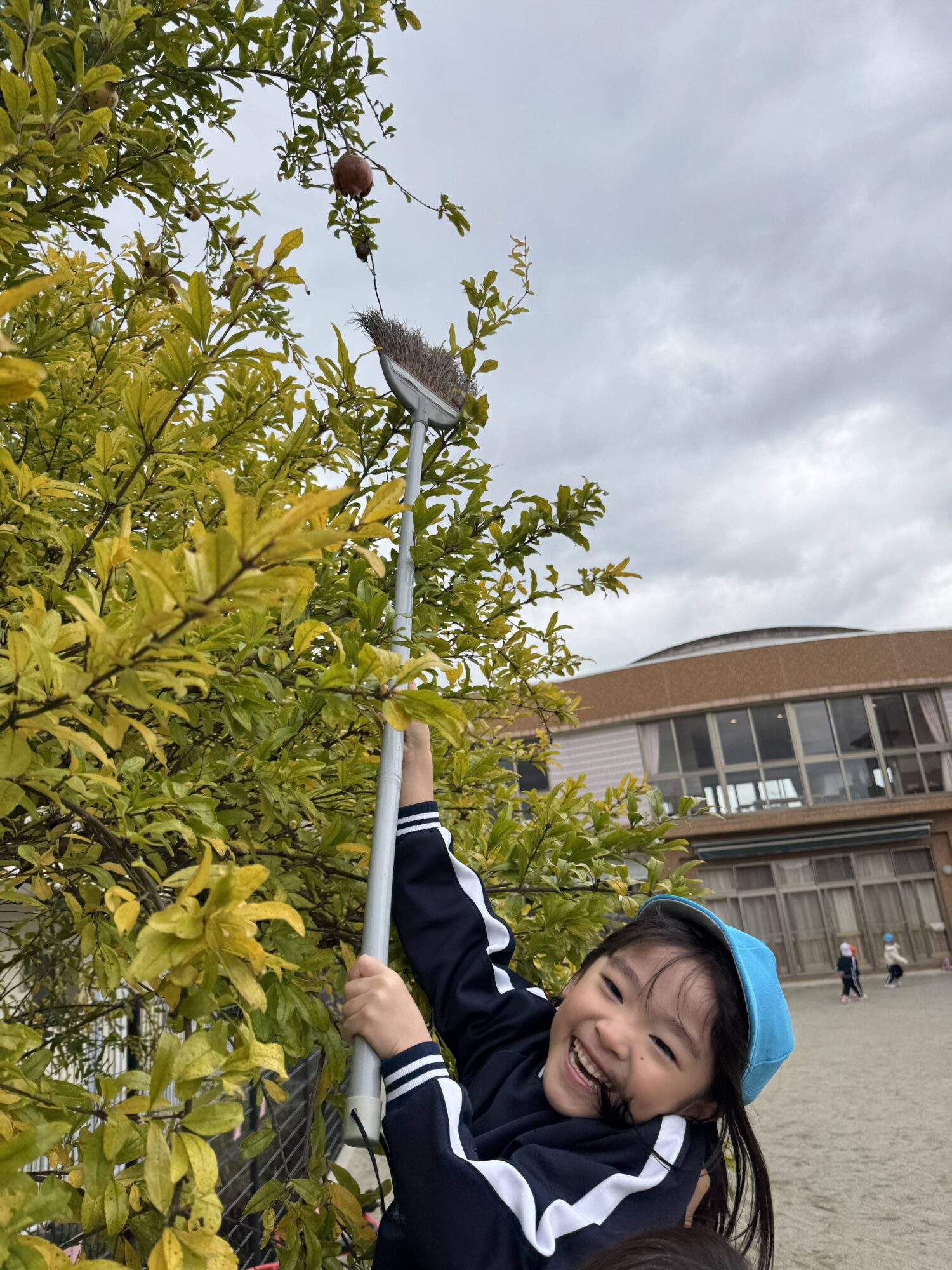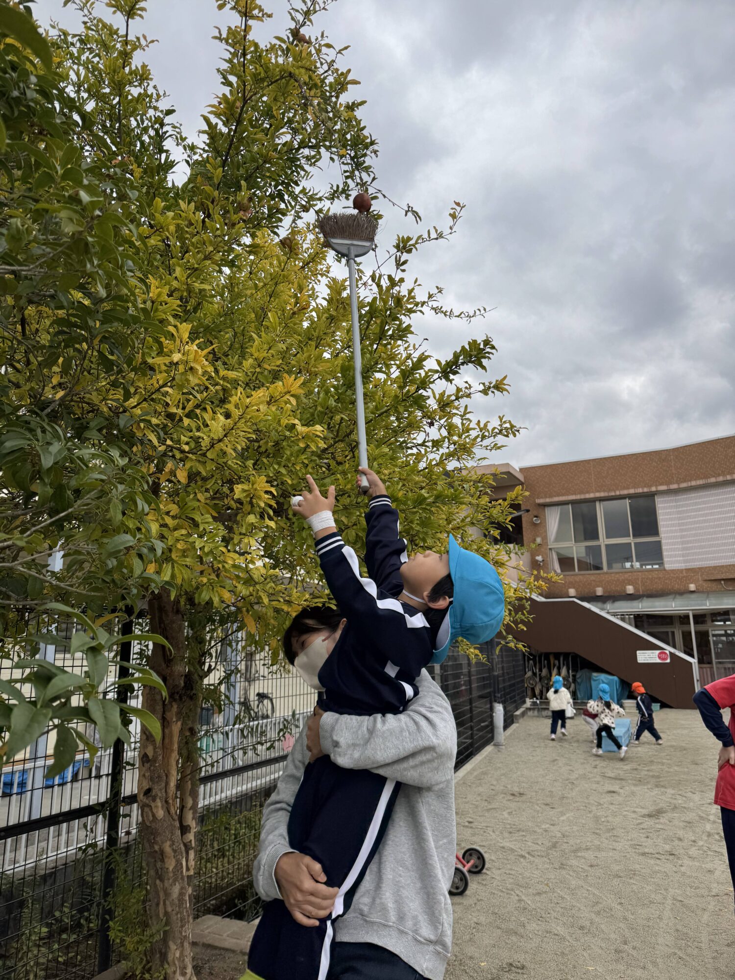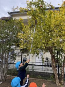みんなの「取りたい!」という思いを背負い、園長先生がザクロにホウキをしっかり巻き付けて、ネジネジと工夫しながら挑戦!