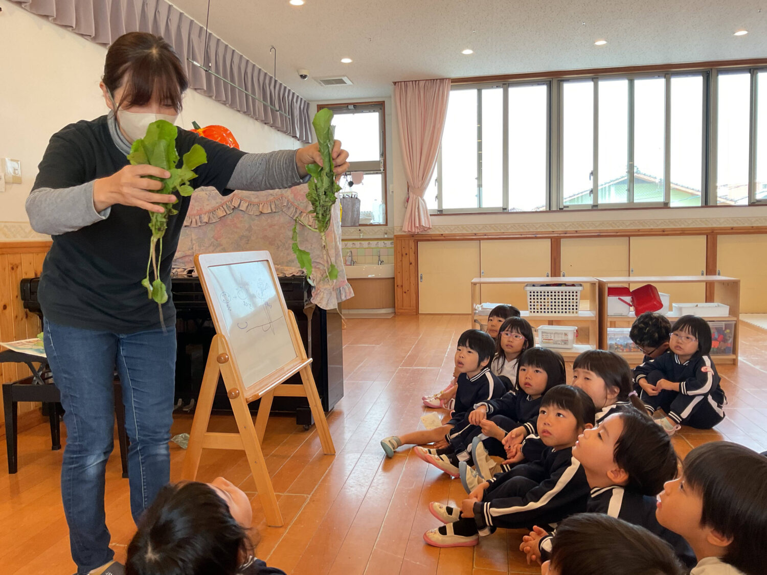 「大根の葉もお料理したら食べられるらしいよ」と伝えると、「お味噌汁に入れたことあるよ」、「食べたい!」と、みんな大盛り上がりでした☺️