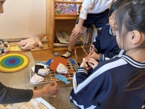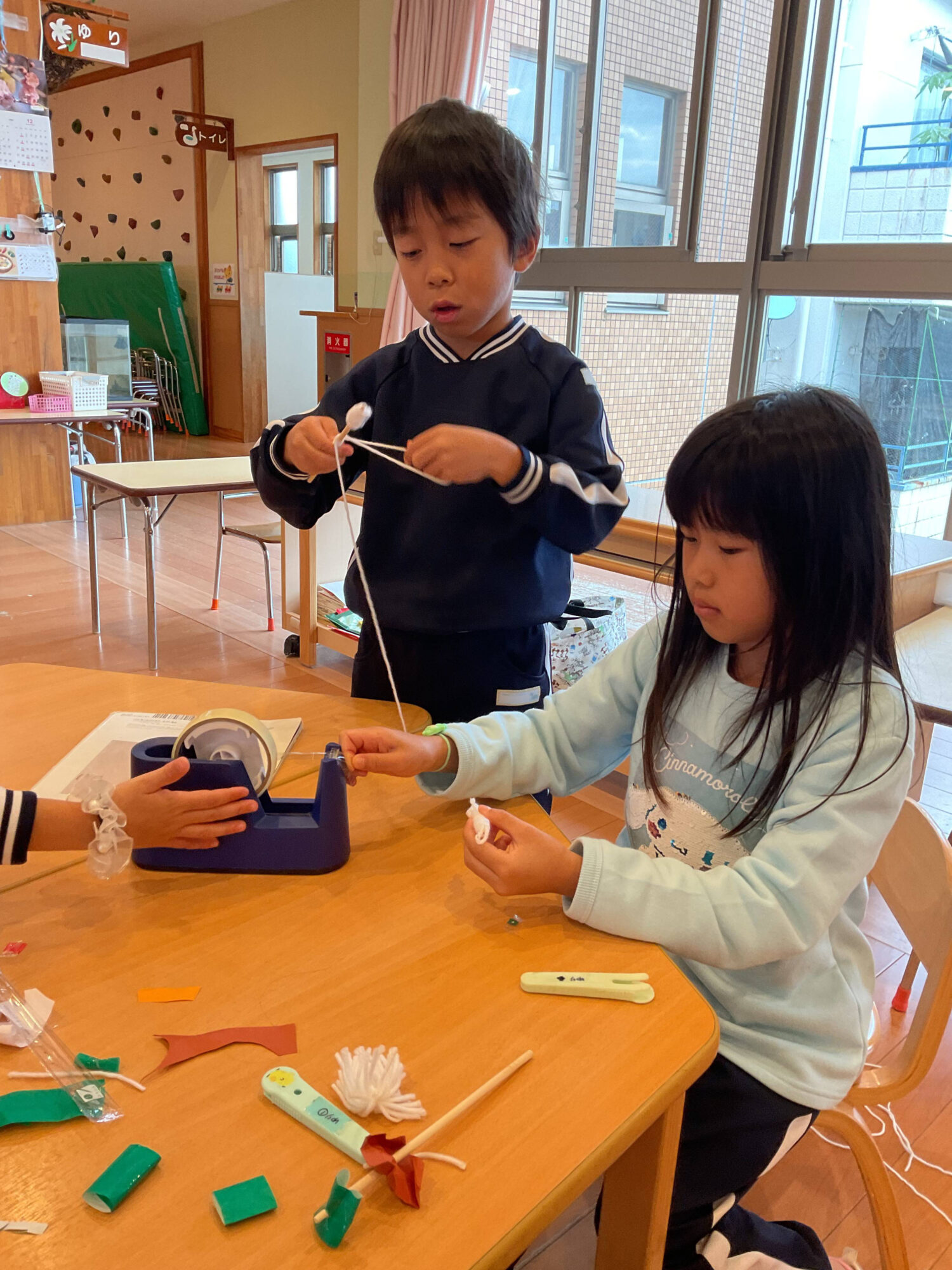 割り箸の先に毛糸を巻きつけて、マシュマロの製作中✨