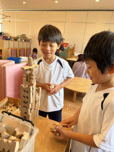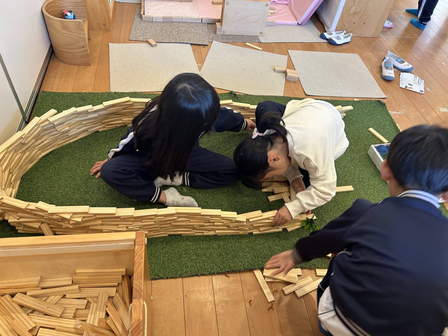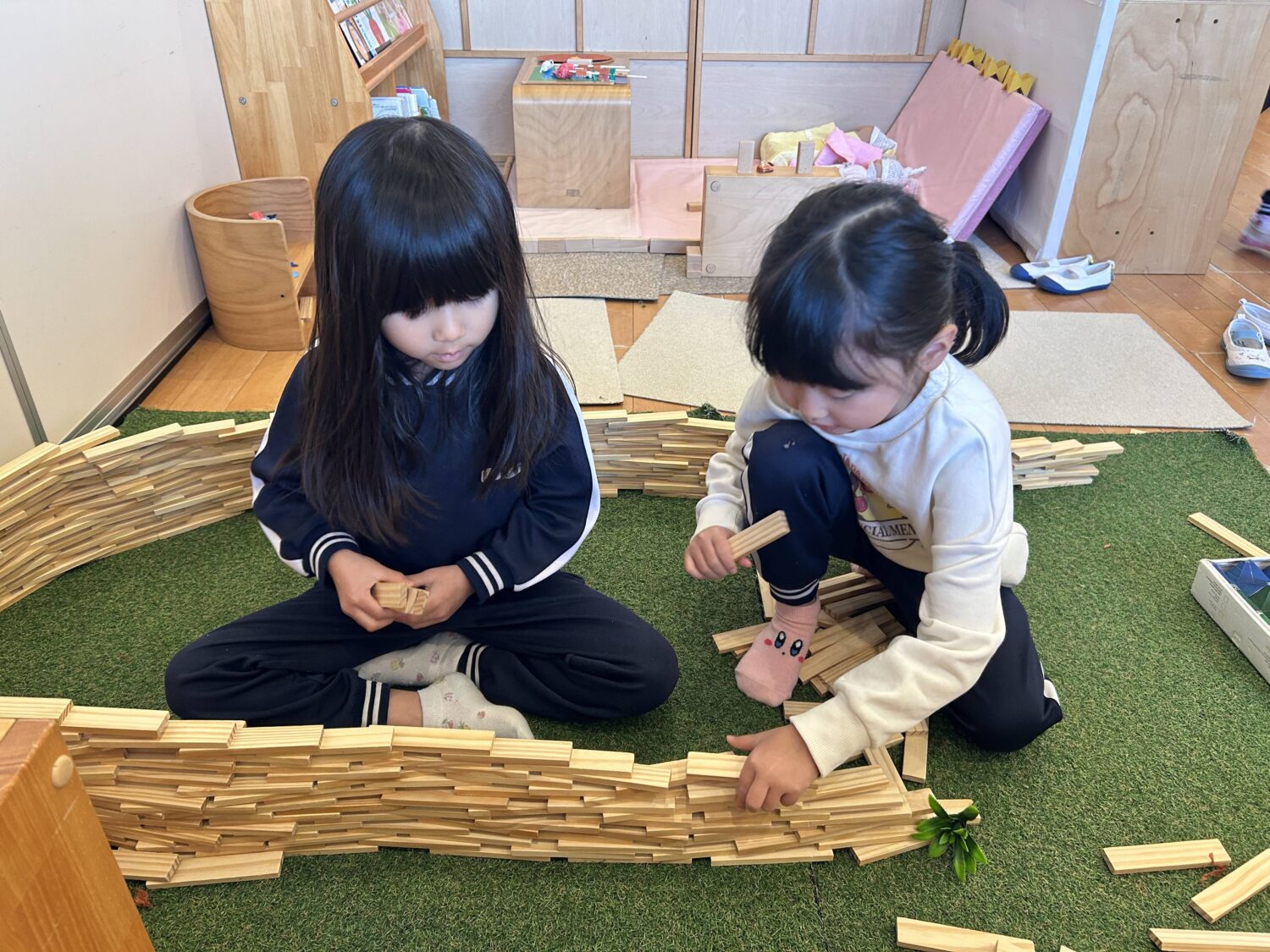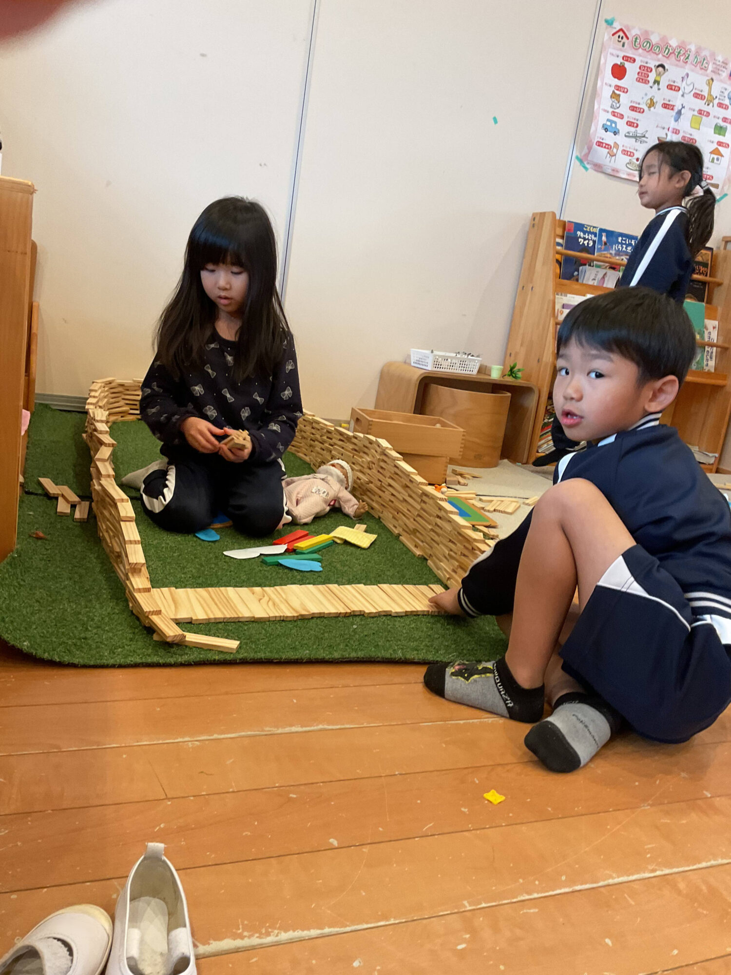 「芝の上にキャンプテント🏕️を作ろう」と積木積んで作業スタート!