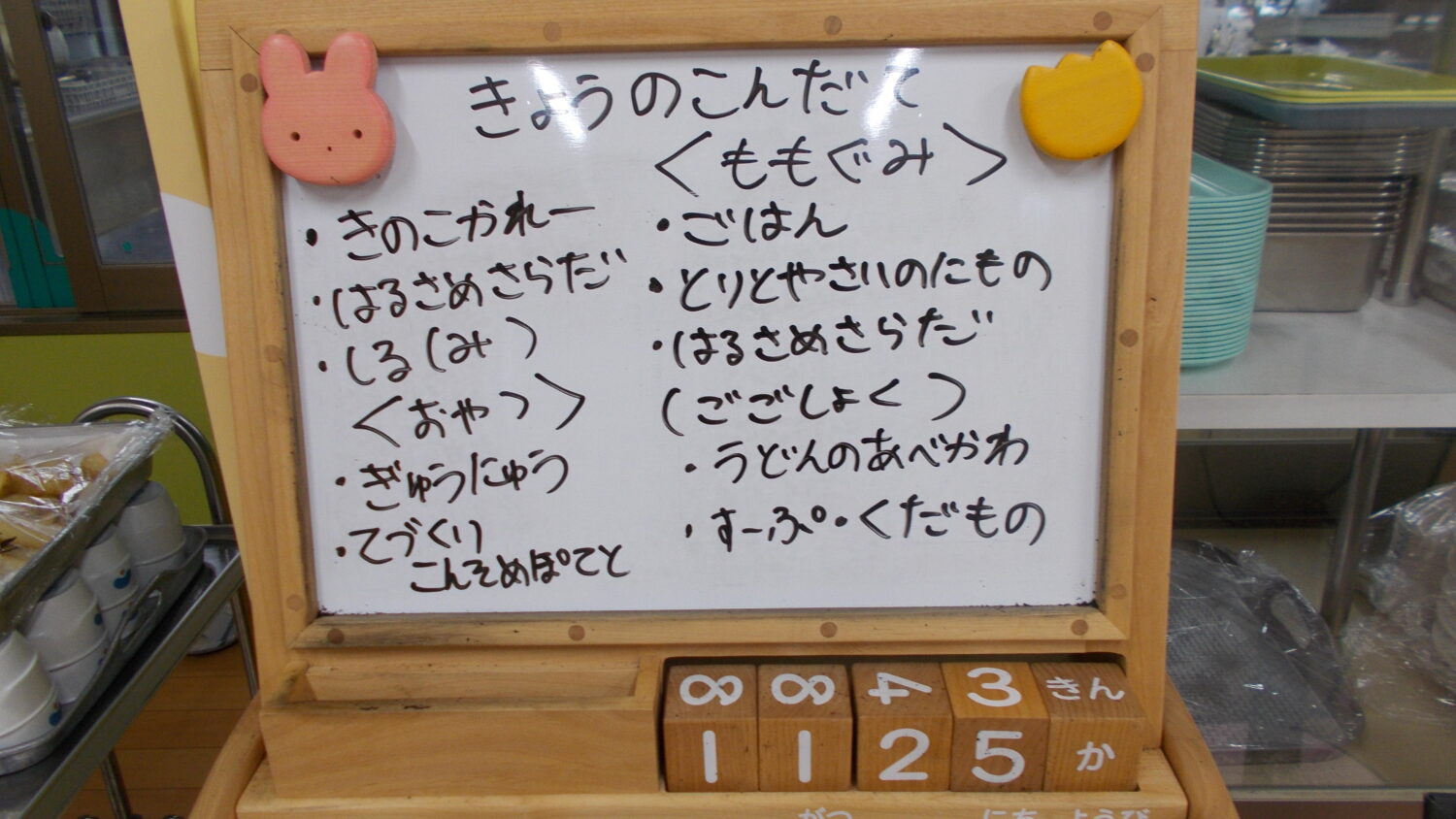 献立に変更があります。もも組の午後食がうどんのあべかわにかわっています。