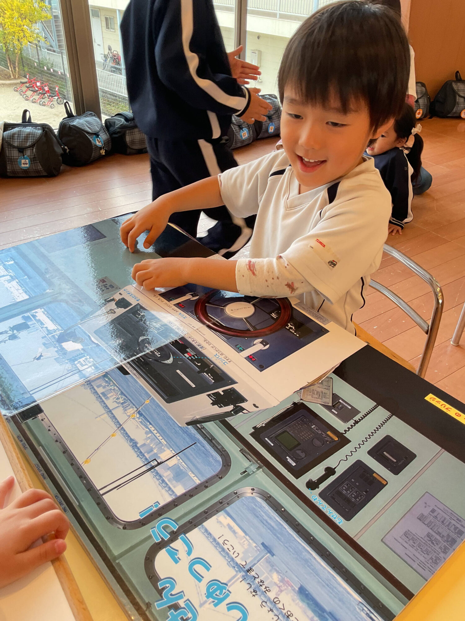 大型絵本の車や船の操縦席のページを見ながら、憧れの運転手さんになりきり中👨🏻✈️