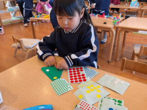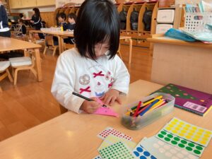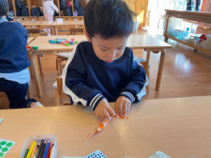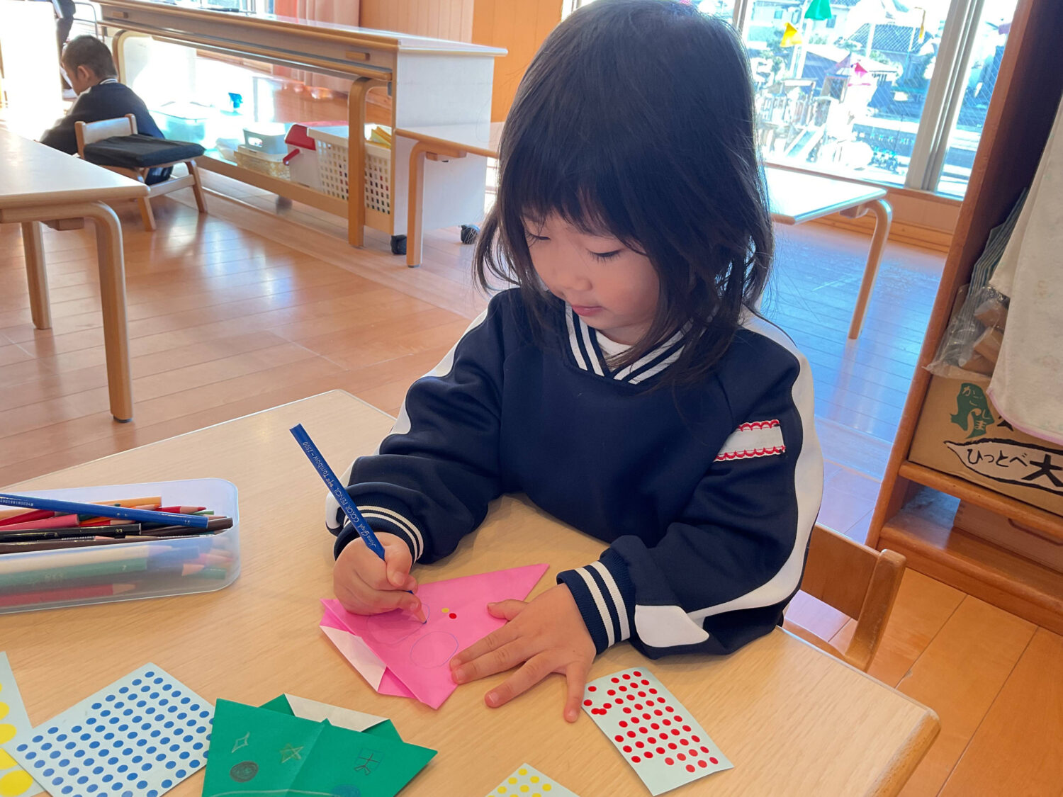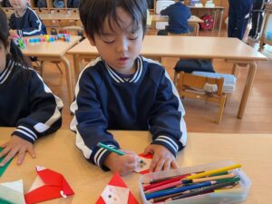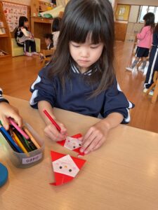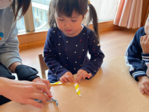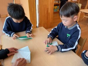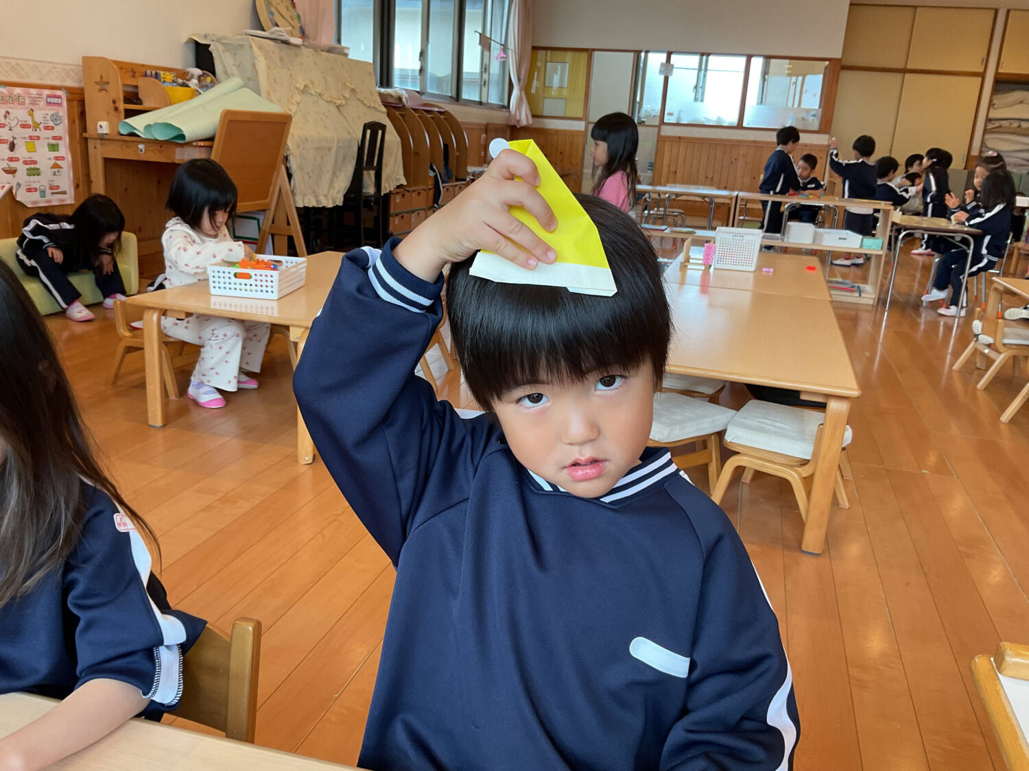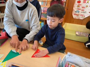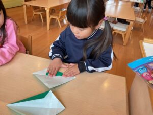 これまで何度か折り紙製作をしてきましたが、経験を重ねていく中で、角を合わせたり、指先で折り目をしっかりつけたりと丁寧に作ろうとする姿が多くなっているように感じました😊