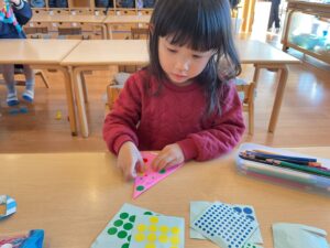 園でも、折り紙を使ってクリスマスの製作を行い、子ども達はサンタやサンタの帽子、キャンディ、クリスマスツリーなど作品づくりを楽しみました。